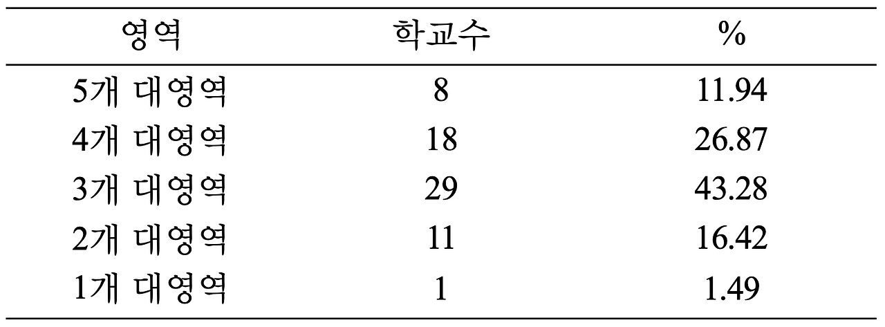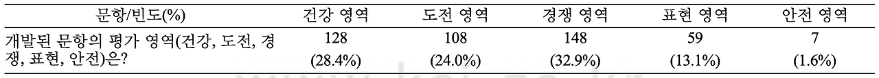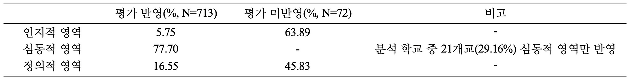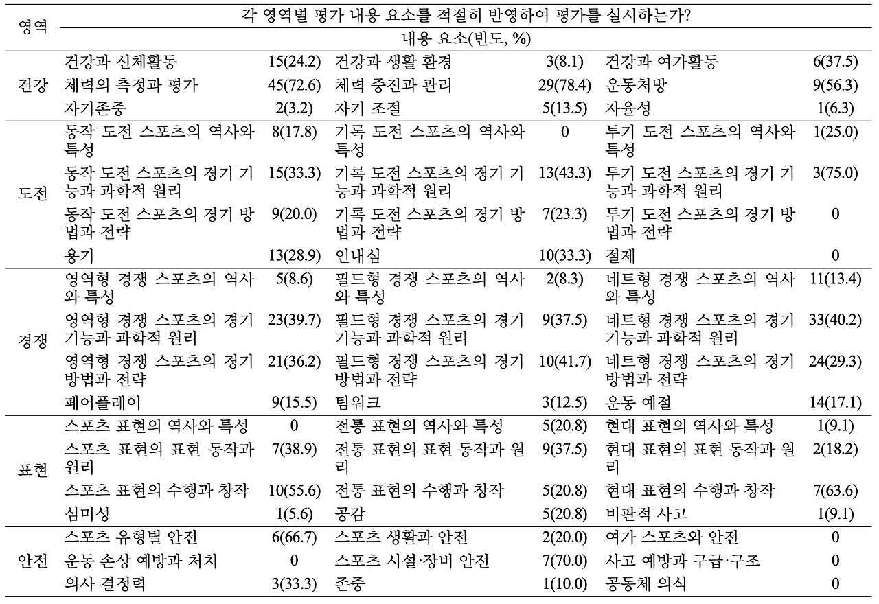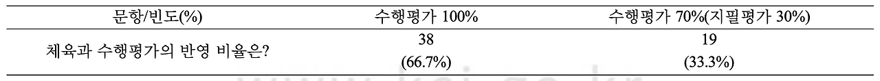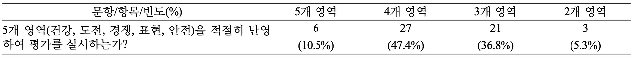 체육 교과의 내용 영역별 평가 반영 현황은 '가르친 것을 평가한다.'는 기본적인 대전제가 생각보다 잘 지켜지고 있지 않음을 보여준다. 과거 7차 교육과정 당시만해도 교육부와 교육청에서 체육 교과와 관련하여 평가의 반영비율(지필평가 30%, 수행평가 70%)과 수행평가 항목(3개)을 명확하게 안내했던 시기가 있었다. 아무래도, 이후에 이러한 패턴이 학교에 자리잡게 되었고 교육과정이 개정되고 대부분의 학교에서 '체육 교과는 수행평가 100% 반영'이 자리잡게 되었음에도 불구하고 학기 당 3개의 내용을 지도하고 평가한다는 것이 관습적으로 자리하게 되지 않았나 유추해본다. 비중이 아무리 작은 영역이라도 가르치고 평가해야 한다는 것이 교육과정에서 기대하는 기본적인 원칙임을 고려해보면, 조금은 아쉬움이 남는 부분이다.