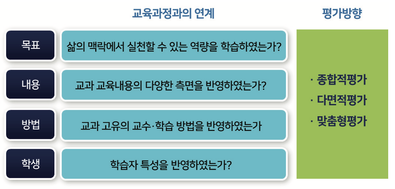 교육과정문서에서 안내하고 있는 평가의 방향과 방법이, 지금까지 내 나름대로 느꼈던 아쉬움 그리고 개선방향과 대체로 비슷한 것 아닌가 싶다. 즉, 체육교육전문가들이 연구하여 만든 교육과정문서에 나타난 바람직한 평가의 모습이 일선 현장의 교사들이 상식적인 수준에서 이해하고 공감할 수 있는 일반적인 내용이라는 뜻이다. 현장의 교사들이 평가 설계에 너무 큰 부담을 느끼지 말고, 교사라면 본능적으로 알고 있는 좋은 평가를 하고 싶다는 생각을 했으면 좋겠다. 교육과정문서의 문장 하나하나를 외우지 말고, 다음의 그림처럼 전체적인 맥락을 이해하면 평가도구를 설계할 때 자연스럽게 녹아들어가지 않을까 생각한다.
