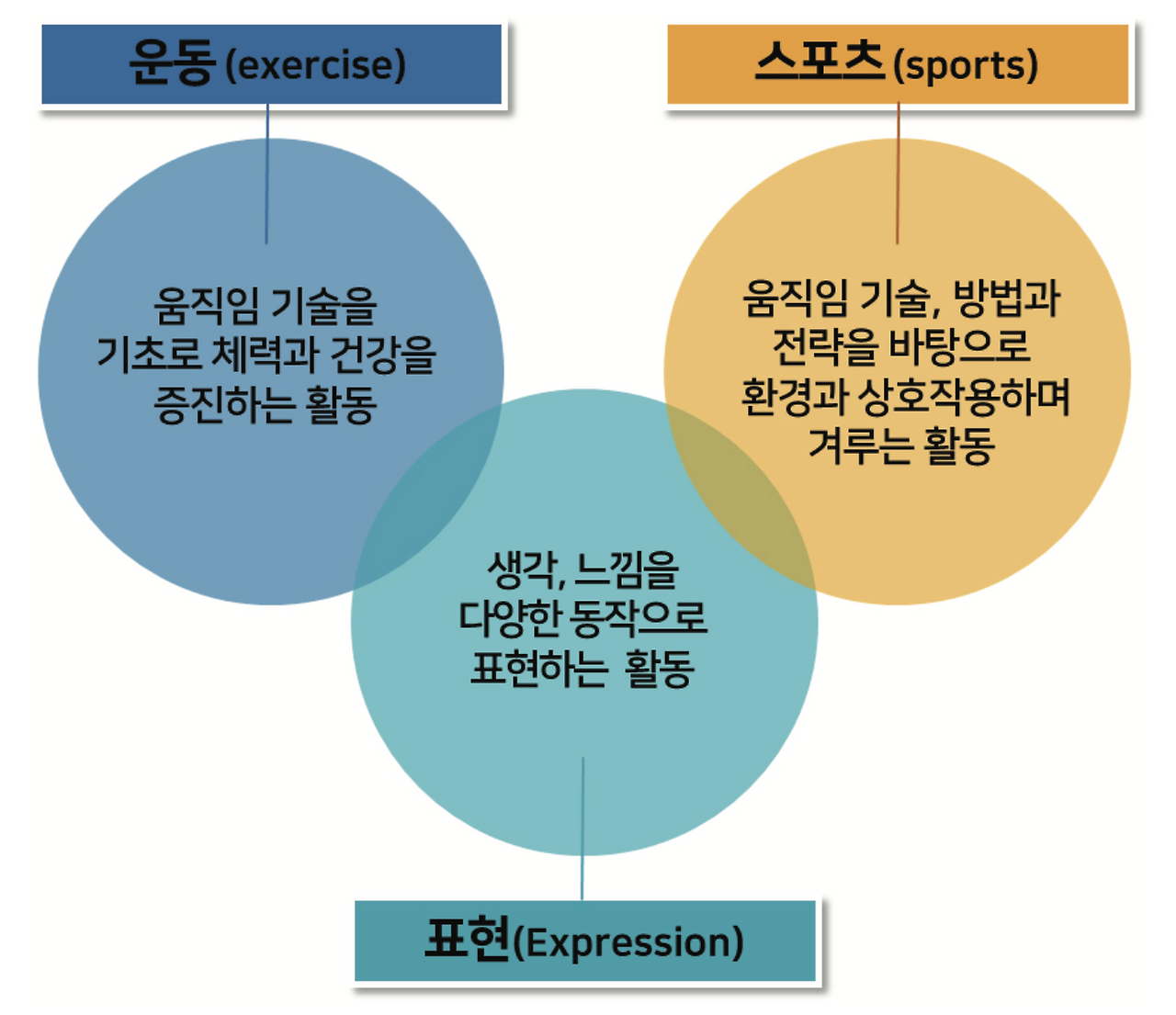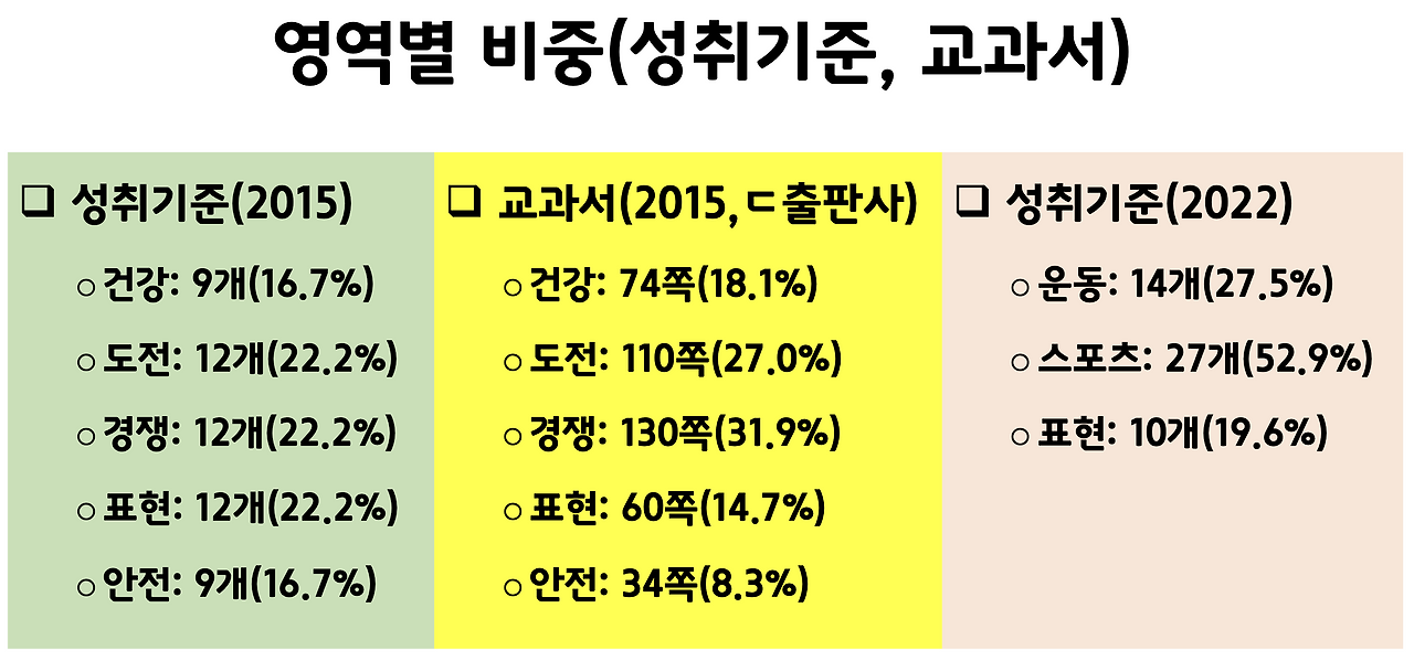 2022개정 체육과 교육과정에서 기존의 5개 영역(건강, 도전, 경쟁, 표현, 안전)이 3개(운동, 스포츠, 표현)로 재구성되면서 기존의 건강 영역 내용을 계승하는 운동 영역의 비중이 상대적으로 커진 것을 알 수 있다. 아마도 시대적 배경이 2020년부터 전세계적으로 코로나19 감염병 확산 등으로 개인이 자신의 건강을 관리하기 위한 운동을 직접 설계하고 실천할 수 있는 역량에 대한 관심이 커졌기 때문이기도 하겠지만, 우리사회가 선진국으로 접어들면서 건강을 위한 운동에 직접 참여하는 인구가 점점 더 늘어나고 있다는 맥락이 이러한 변화의 주요인이 아닐까 생각한다. 교사는 이러한 맥락을 이해하고 영역별로 균형감있게 내용을 선정하고 교육과정을 재구성하면 될 것이다.
