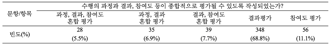 과정중심평가는 잘 운영되고 있을까. 연구결과를 보면 과정중심평가가 본격적으로 강조되기 시작했던 2019~2020년 당시의 사례 분석이라고는 것을 감안하더라도 아쉬운 부분이 크게 느껴진다. 과정중심평가라는 말이 아무래도 교사의 입장에서 생소한 측면이 있고, 기존의 수업과 평가 방식을 혁파되어야 할 구시대의 유물처럼 느껴지게 하는 부분이 있었기에 교사들이 받아들이기 어렵기도 했던 것 같다.