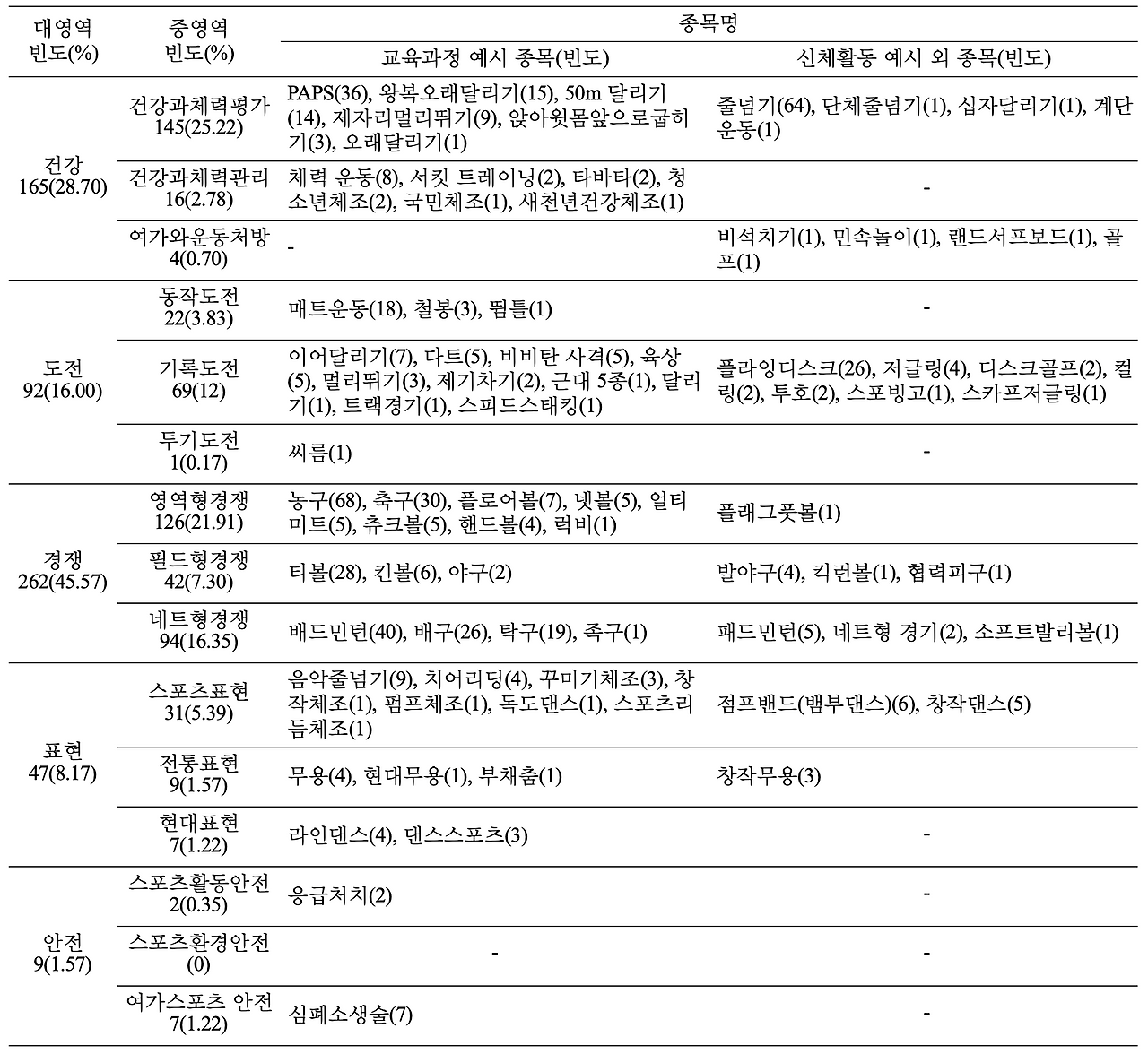 먼저, 교육과정문서와 교과서의 내용 영역별 비중이다. 2015개정 체육과 교육과정에서 영역별 성취기준의 개수를 단순히 종합해보면 '스포츠'를 주로 다루는 도전과 경쟁 영역의 성취기준이 총 24/54개(44.4%)의 비중을 차지하고 있다. 교과서의 쪽수에서도 도전과 경쟁 영역의 합이 240/408쪽(58.9%)로 압도적이다. 2022 개정 체육과 교육과정에서도 마찬가지로 스포츠 영역의 성취기준이 27/51개(52.9%)로 절반 이상을 차지한다. 체육 교과에서 어떤 내용 영역이 중요한지 단순한 양으로 판단한다는 것이 우습기는 하지만, 가장 쉽게 살펴볼 수 있는 상대적 비중도 그렇고 실제로 체육 교사들이 느끼기에도 학교 체육 교과 수업에서 가장 중요하게 다루고 있는 부분은 '스포츠'가 맞는 것 같다. 개인적으로도 동의하며 그렇게 되어야 한다고 생각하고, 체육교육 전문가가 아닌 일반적인 사람들의 시각 역시 비슷하다고 느껴진다.
