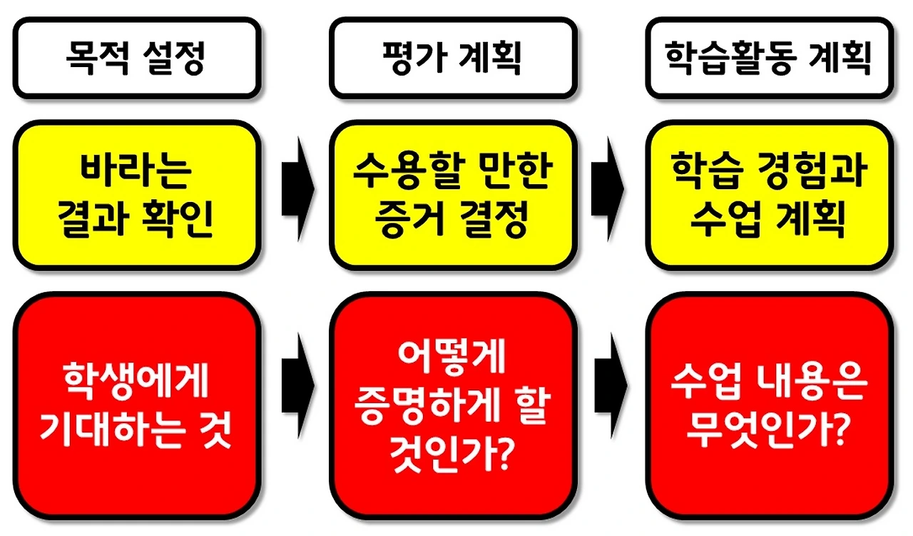 체육 교사라면 어떤 학교의 체육 교과 수업이 궁금할 때는 그 학교의 체육 교과서를 살펴보는 것이 아니라, 그 학교의 체육 교과 평가계획서를 살펴보기 마련이다. 체육 교과는 학습활동의 특성과 해당 학교의 체육 학습환경 특성, 그리고 교사의 전문적인 판단에 따라 교육과정을 재구성하여 수업을 하기 때문이다. 7차 교육과정 때까지만 해도, 대부분의 학교 운동장 크기가 비슷하였고, 표준화된 학습환경(시설, 교구)을 갖추기 위한 노력으로 교사의 자율적 교육과정 재구성 필요성이 크지 않았다. 하지만, 그 때도 체육 교과는 체육교과협의회를 통하여 학교의 학습환경에 맞게 선택적인 수업이 진행되었으며, 평가도구의 설계는 전적으로 체육 교사의 전문성이 필요한 영역이었다. 즉, 체육 교과는 오랜 시간동안 교사들이 일상적으로 교육과정을 재구성하여 수업을 운영하고 평가도구 역시 직접 설계하여 진행하는 경험적 지식을 축적하고 있다. 이러한 수업 설계 방식을 '백워드 교육과정 설계 모형'이라고 부르는데, 교육부에서는 성취기준 달성을 통한 역량 함양을 강조하는 2015개정 교육과정의 도입과 더불어 체육 교과가 아닌 모든 교과에서 이 방식을 권장하기 시작했다.