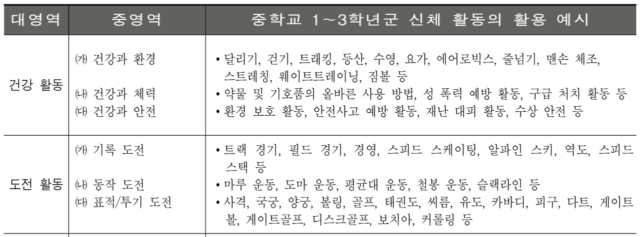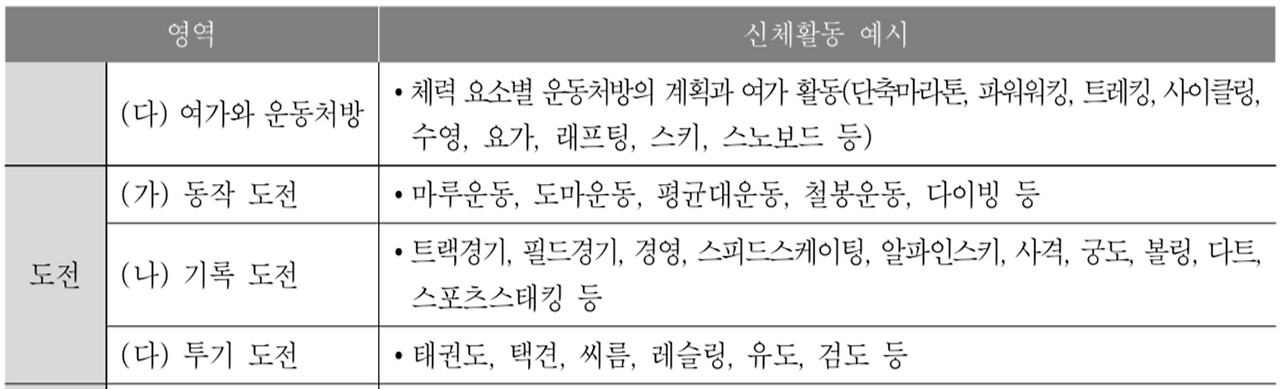2015 개정 체육 교육과정에서 ‘도전-(나)기록 도전’ 영역 신체활동의 예시로 트랙경기, 필드경기, 경영, 스피드스케이팅, 알파인스키, 사격, 궁도, 볼링, 게이트골프 등을 제시하고 있다. 이러한 스포츠 종목들의 공통점은 명확한 단위로 정의되는 기록을 바탕으로 목표를 설정하고 도전해 나간다는 것이다. ‘보다 아름다운 동작을 만들어낸다.’와 같은 추상적인 목표가 아닌 누구나 쉽게 이해하고 목표를 설정할 수 있는 구체적인 기록을 사용하기 때문에, 학생의 입장에서 자기주도적인 목표설정과 학습계획 수립이 용이한 편이다. 이러한 맥락에서 학습의 과정과 기록을 중시하는 과정중심평가를 체육과 기록도전 영역의 교수학습방법과 평가에 적합한 개념으로 이해할 수 있을 것이다. 과정중심평가를 실천하기 가장 용이한 영역이 바로 기록 도전이라고 할 수 있다.