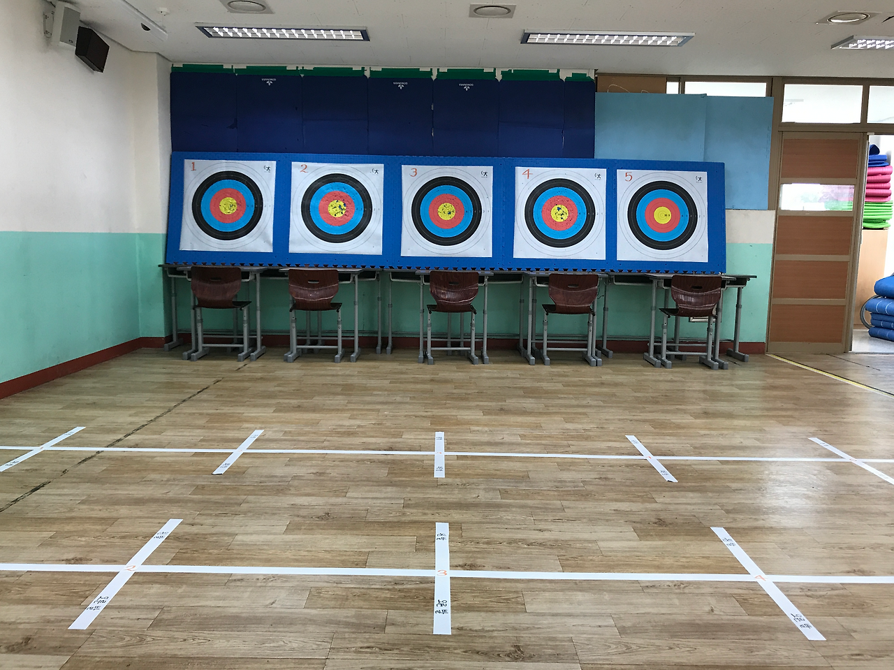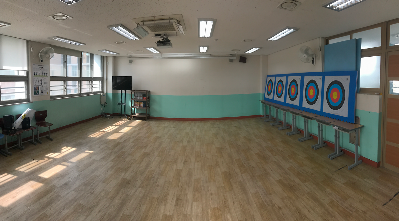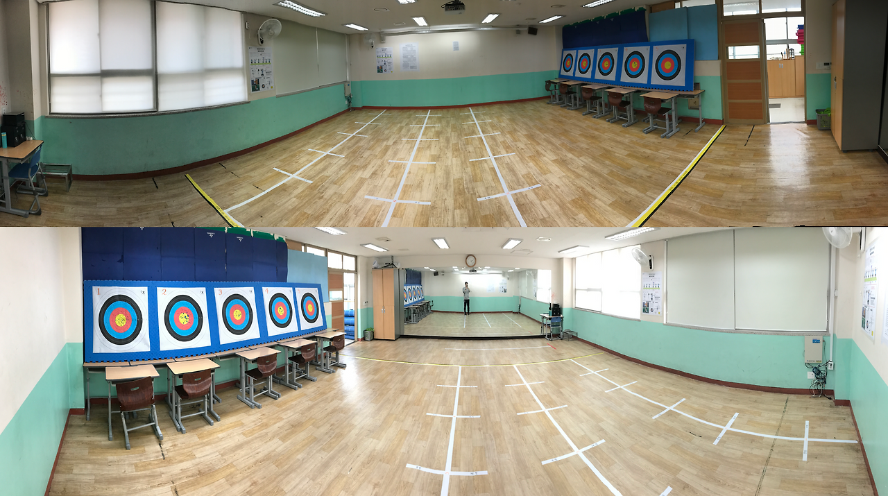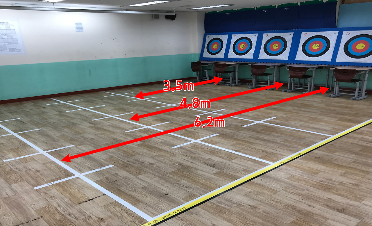 양궁 수업은 무용실에서 진행하는 것으로 계획을 하였으며, 학급당 인원에 맞추어 적어도 1차시 안에 1인당 10발 정도의 사격은 가능하도록 공간과 모둠별 로테이션 시스템을 조직하였다. 특정한 시기에 집중적으로 양궁 수업을 하지 않고, 봄철 미세먼지와 장마철 우천 등을 대비하여 주 1회 수업을 진행하는 것으로 계획하였다. 학습공간의 구체적인 설계는 다음 사진에서 보는 것과 같이 구성이었다.