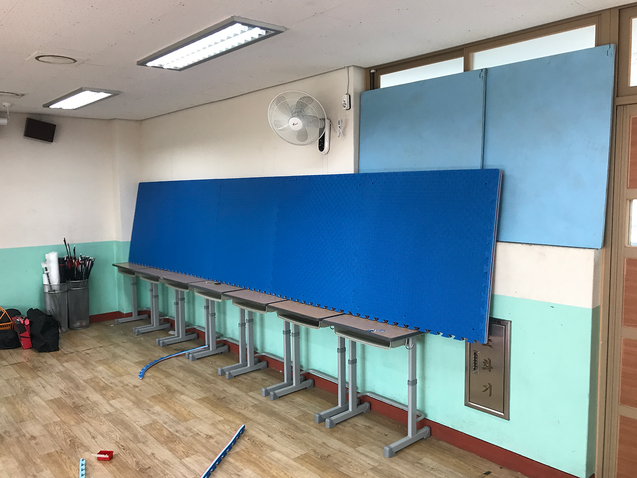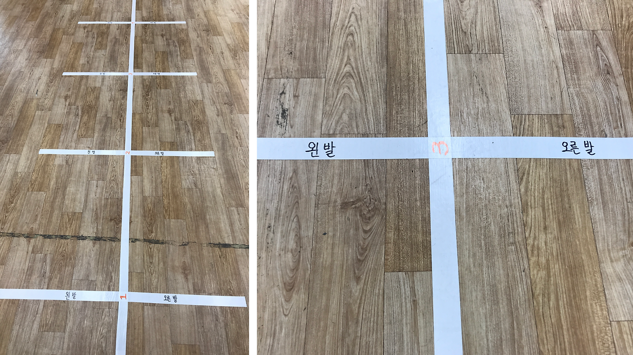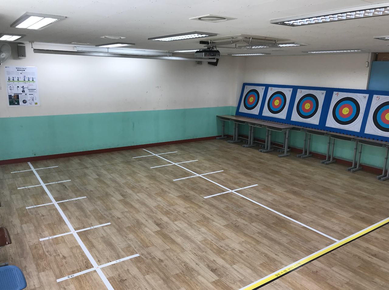 양궁 수업은 무용실에서 진행하는 것으로 계획을 하였으며, 학급당 인원에 맞추어 적어도 1차시 안에 1인당 10발 정도의 사격은 가능하도록 공간과 모둠별 로테이션 시스템을 조직하였다. 특정한 시기에 집중적으로 양궁 수업을 하지 않고, 봄철 미세먼지와 장마철 우천 등을 대비하여 주 1회 수업을 진행하는 것으로 계획하였다. 학습공간의 구체적인 설계는 다음 사진에서 보는 것과 같이 구성이었다.