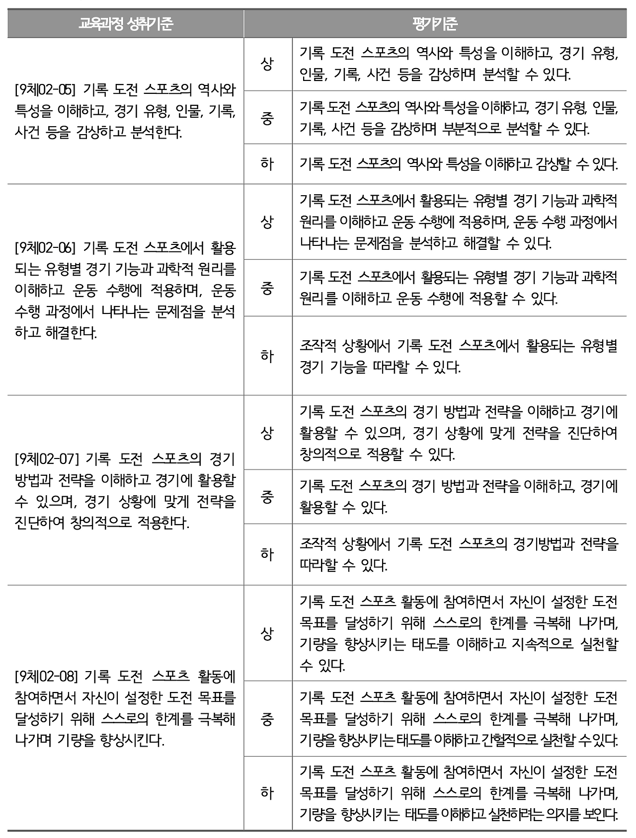 2015개정 체육 교육과정에서는 ‘기록 도전’과 관련하여 다음과 같이 기술하고 있다. “기록 도전은 속도나 거리의 한계에 도전하여 최상의 운동 수행 능력을 발휘하는 활동으로 힘들고 어려운 상황에서도 꾸준한 노력을 다하는 것이 중요하다. 자신과 타인의 기록을 극복하기 위한 과학적인 연습과정과 기록비교를 통해 자신의 기량을 보다 발전시킬 수 있는 활동이 되도록 한다.”