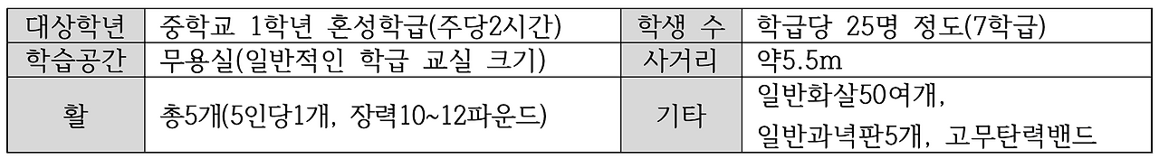 둘째, 소량의 양궁 장비를 도입하여 실험적 수업을 진행해본다. 계획된 체육 수업에 지장을 주지 않는 시기에 학생의 안전을 확보한 상황에서 실험적으로 수업을 하며 지도 경험을 축적해야 한다. 이는 체육 수업의 자투리 시간에도 가능하지만, 체육대회의 이벤트 종목으로도 가능하다. 다양한 형태로 가능한 많은 지도경험을 쌓는 것이 중요하다.