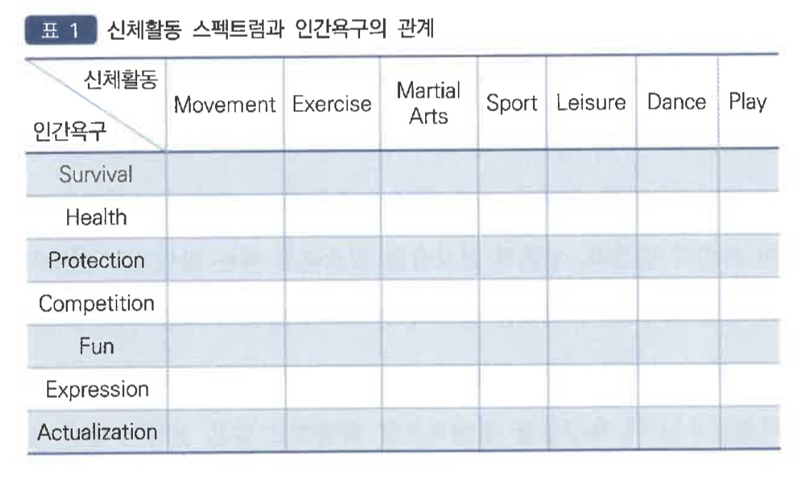 첫째, 무브먼트는 가장 단순한 기계적 성격의 신체적 움직임이다. 둘째, 엑세사이즈는 건강과 체력을 위해서 개발된 특정한 동작들의 연속이나 동작의 집합이다. 셋째, 마샬아트는 무도, 무예, 무술이라고 부르는 특별한 신체활동 유형이다. 넷째, 스포츠는 협소한 의미에서 현재 세계인이 열광하는 올림픽 경기나 월드컵 경기에서 보이는 운동이다. 다섯째, 레저는 재미를 충족시키기 위하여 행하는 신체활동으로서 경쟁보다는 흥미의 추구, 승리보다는 자기실현의 차원에 보다 더 관심을 갖도록 한다. 여섯째, 댄스는 예설적 지향성을 갖는 활동이지만 체육적 장면에서 널리 활용되는 신체활동이다. 일곱째, 플레이는 술래잡기, 잣치기 등 신체활동이 많이 관여되는 비교적 단순한 구조를 지닌 놀이형 활동이다.