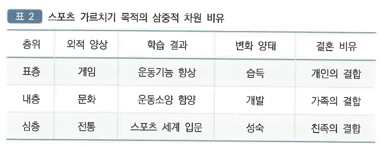 신체활동을 가르쳐서 모종의 변화를 도모하는 스포츠교육은 '습득·개발·성숙'의 수준에 해당하는 교육을 펼친다. 습득은 표층적 수준, 개발은 내층적 수준, 성숙은 심층적 수준에까지 도달하는 스포츠교육의 목적이다. 스포츠교육이 표층적 수준에 머무를 때 그것은 습득 수준의 변화에 머무른다. 내층을 넘고 심층까지 도달하면, 그것은 각각 개발 수준의 변모와 성숙 수준의 변신에까지 이른다.