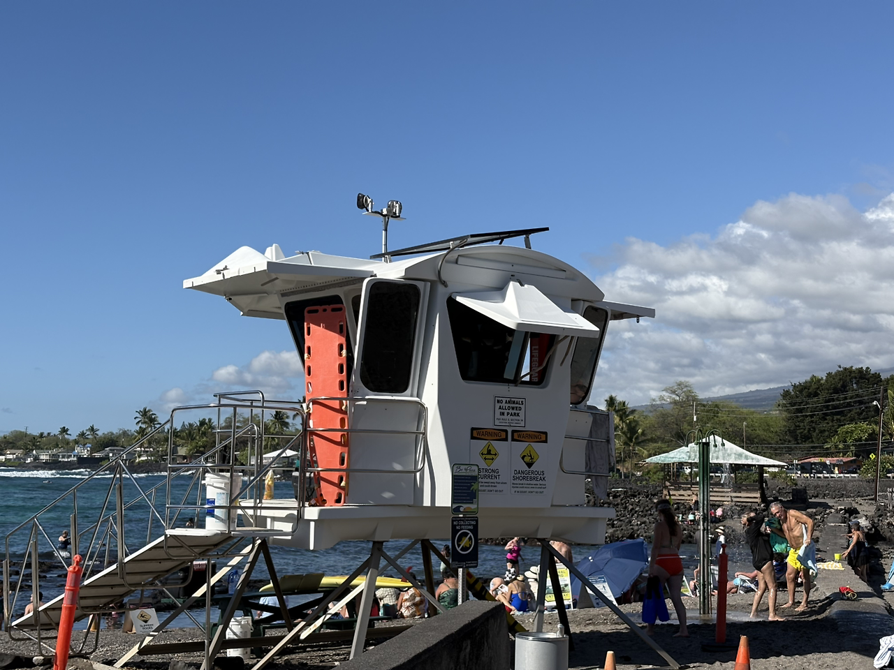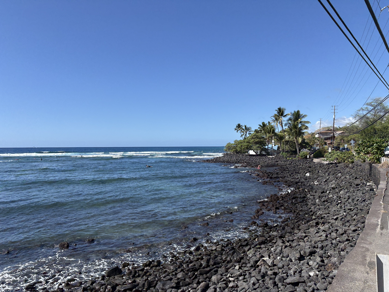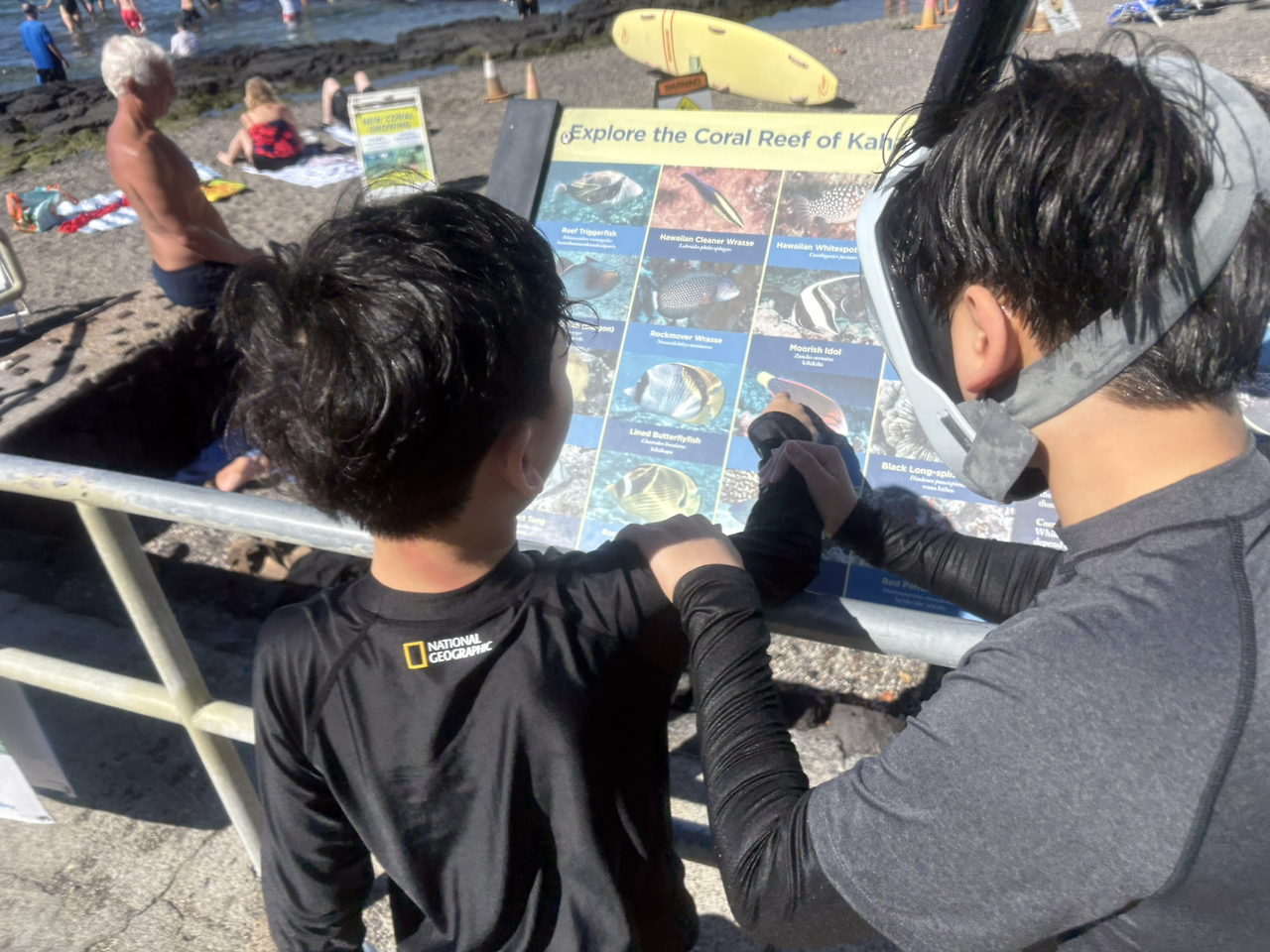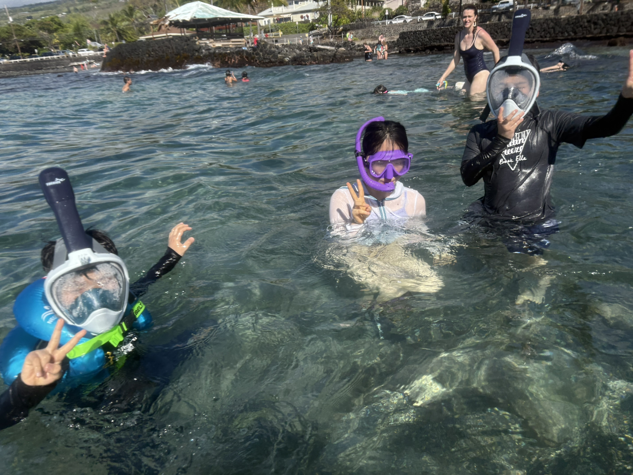 그런데, 문제가 하나 있었다. 해변의 아름다운 풍경과는 다르게 바다가 시작되는 지점부터는 바닥면이 돌로 되어 있었다. 수영을 하는 사람들이 없는 것은 아니었지만, 생각보다 사람이 많지 않고 우리 아이들 역시 물에 들어가기를 주저하는 모습이었다. 시간이 모든 요소 중 가장 높은 가치를 차지하는 여행이었다. 장소 선택에 실패하였음을 인정하고 빠르게 대안을 실행하기로 하였다. 이번에는 아내가 지정해두었던 위치인 '카하루우(Kahalu'u Beach)'로 이동하였다. 우리가 상상했던 열대 물고기와 함께하는 스노클링을 꿈꾸며.