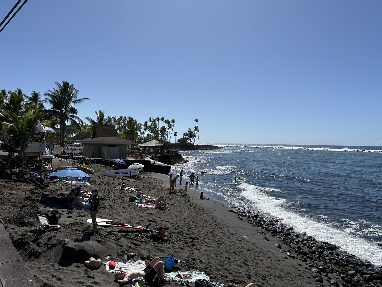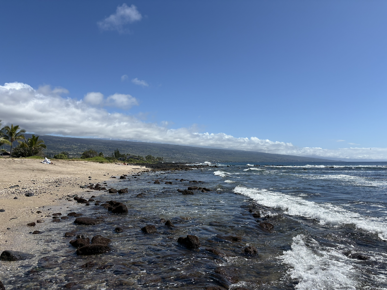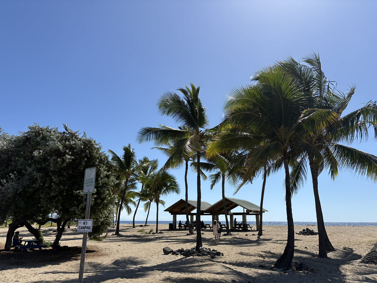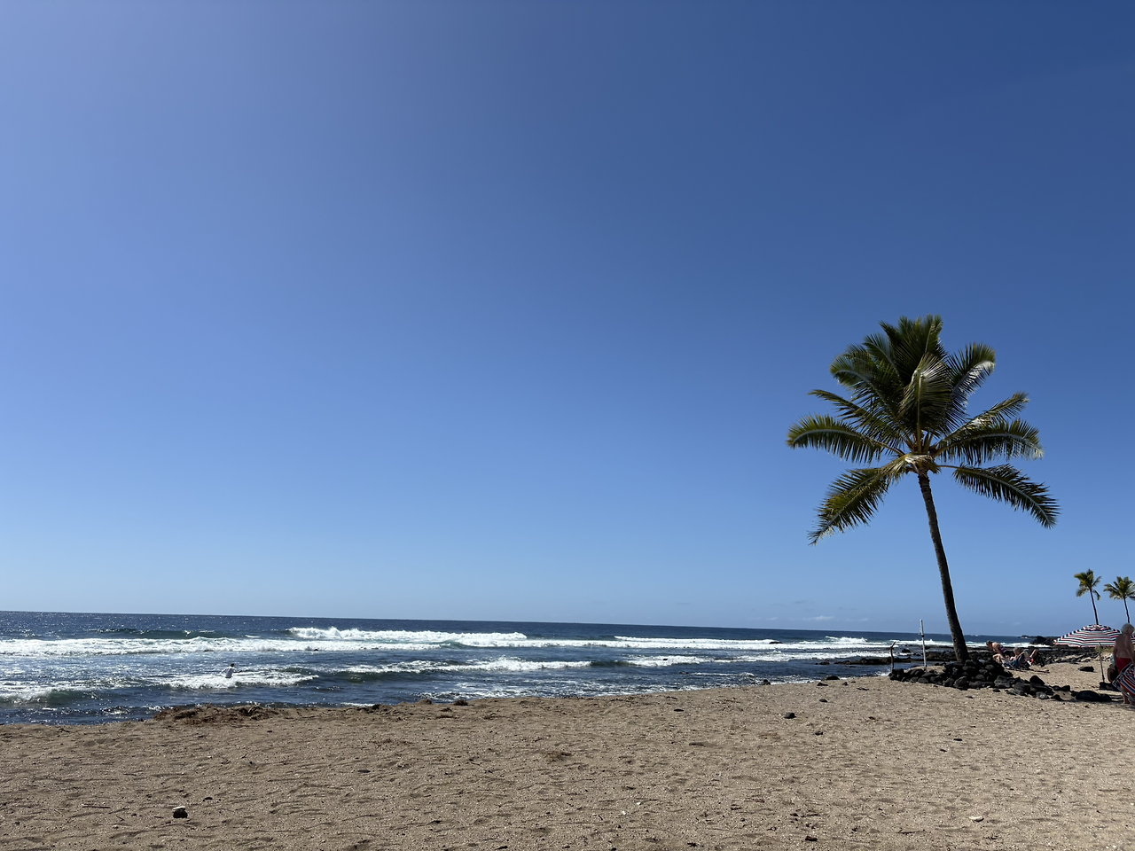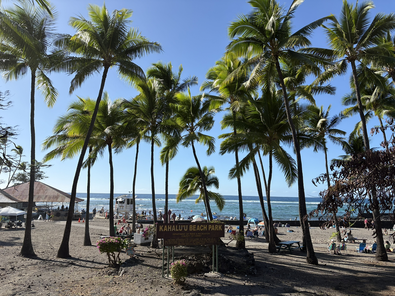 카이루아 비치는 아내가 공부해 둔 해변은 아니었지만, 코스트코에서 가장 가까운 해변인데다가 구글 지도의 후기도 좋아 내가 가자고 한 해변이었다. 영어로 '옛날공항해변(Old Kona Airport Beach)'고도 부르는데, 실제로 가보니 활주로로 사용했던 넓은 아스팔트 길을 주차장으로 하는 모습이었다. 해변에는 우리나라 해수욕장처럼 백사장이 넓게 펼쳐져 있었고, 화장실이나 그늘막의 테이블 등이 잘 구성되어 있었다. 너무나도 멋진 풍경에 감탄사가 절로 나왔다.