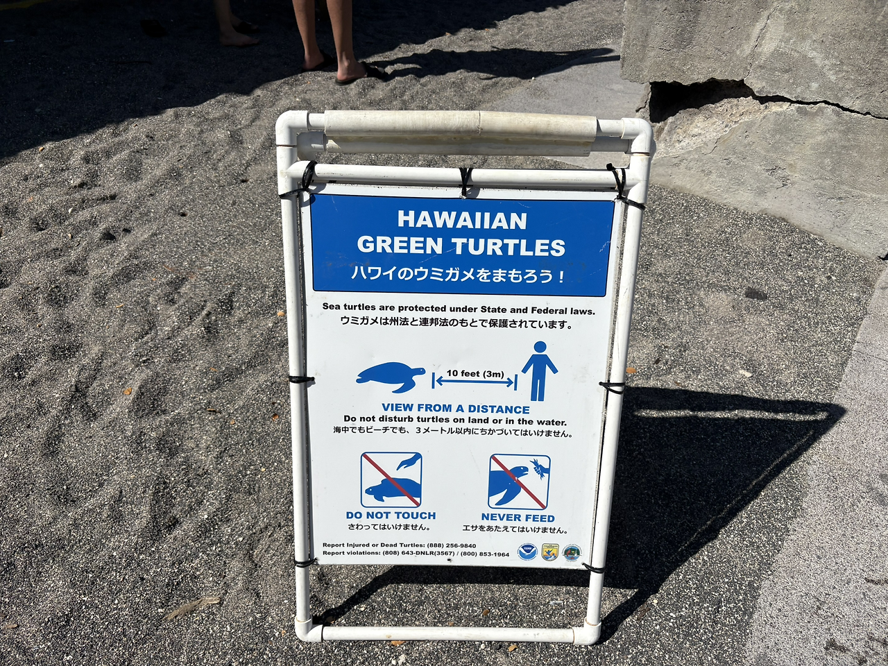 아내의 말을 잘 들으면 자다가도 떡이 생긴다고 한다. 만고불면의 진리였다. 처음부터 여기로 왔어야 했다. 카하루우 해변은 우리가 상상했던 바로 그 바다였다. 카이루아 해변과는 비교할 수도 없는 많은 인파들이 스노클링을 즐기고 있었다. 카이루아 바다와 가장 큰 차이점은 바로 자연적으로 형성된 방파제 역할을 하는 지형의 유무였다. 저 멀리까지 낮은 수심으로 물놀이를 할 수 있게 해주는 천연 방파제 역할의 바위가 바다를 감싸고 있었다. 안내문에 따르면 수 많은 열대어와 함께 수영할 수 있으며, 운이 좋으면 바다거북도 만날 수 있는 모양이었다. 안내문은 사실이었다.