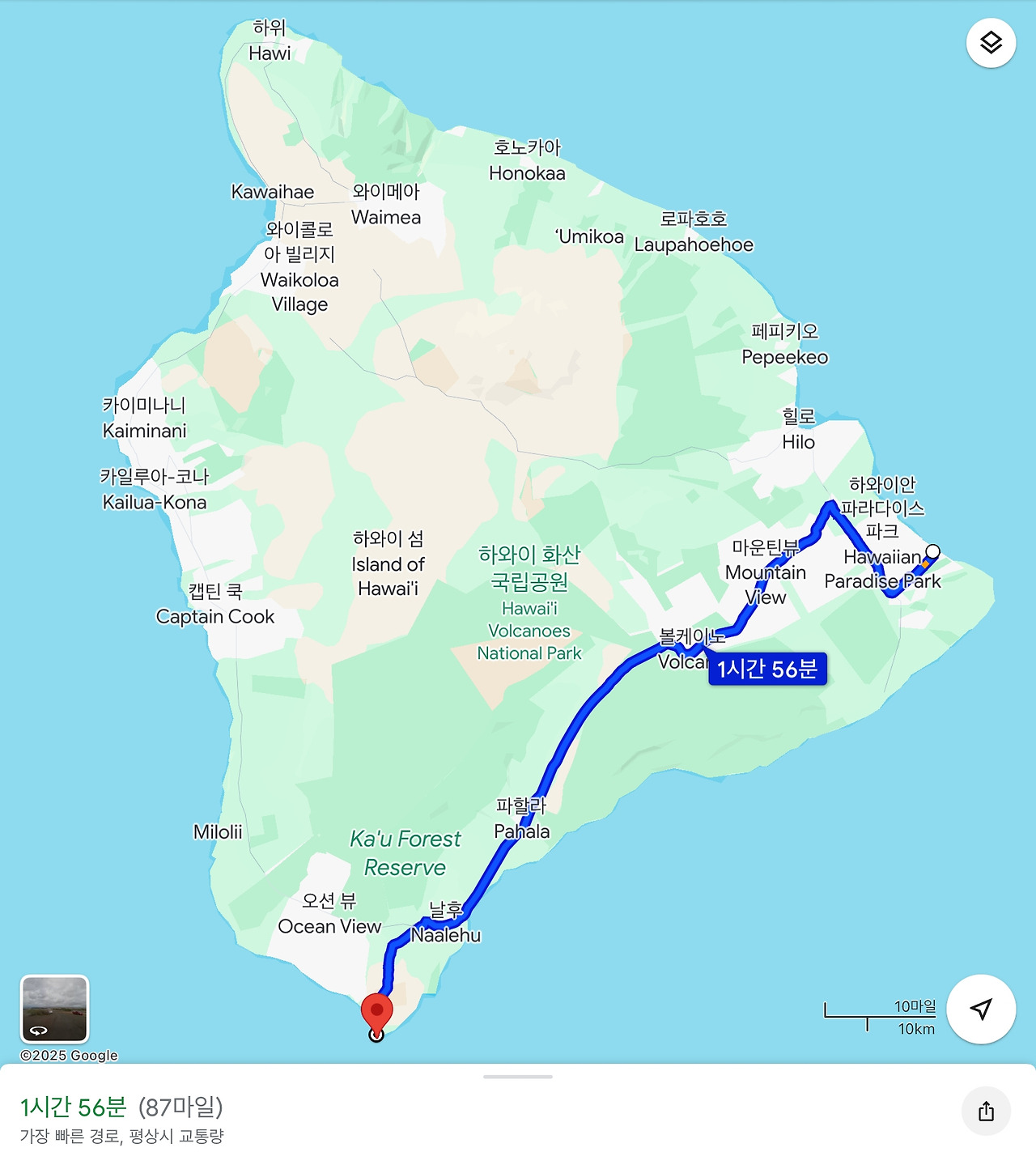 오늘의 일정은 섬의 남쪽 끝까지 가 보는 곳이다. 빅아일랜드 섬의 최남단은 위도 기준으로 미국 영토 전체의 최남단이기도 하다. 여행을 온 외국 사람에서 특별한 의미가 있는 지점은 아니지만, 정보에 따르면 남쪽 해안의 아름다움이 경이적이라고 하였다. 활화산으로 구분되는 마우나로아의 최근 화산활동에 따라 흘러내리는 용암의 대부분은 남쪽으로 흘러내렸다. 따라서, 화산국립공원 지역의 풍경 말고도 남쪽 해안이 전체적으로 화산지역 특유의 해안 형태를 가지고 있으며, 남쪽 해안의 해변들은 대부분 검은색 바위 또는 모래로 이루어져 있어 다른 해변과도 차별화된 느낌을 준다고 하였다. 긴 거리라 운전이 부담스럽기는 했지만, 드라이브를 하면서 보는 풍경이 그렇게 아름답다고 하니 기대감이 컸다.