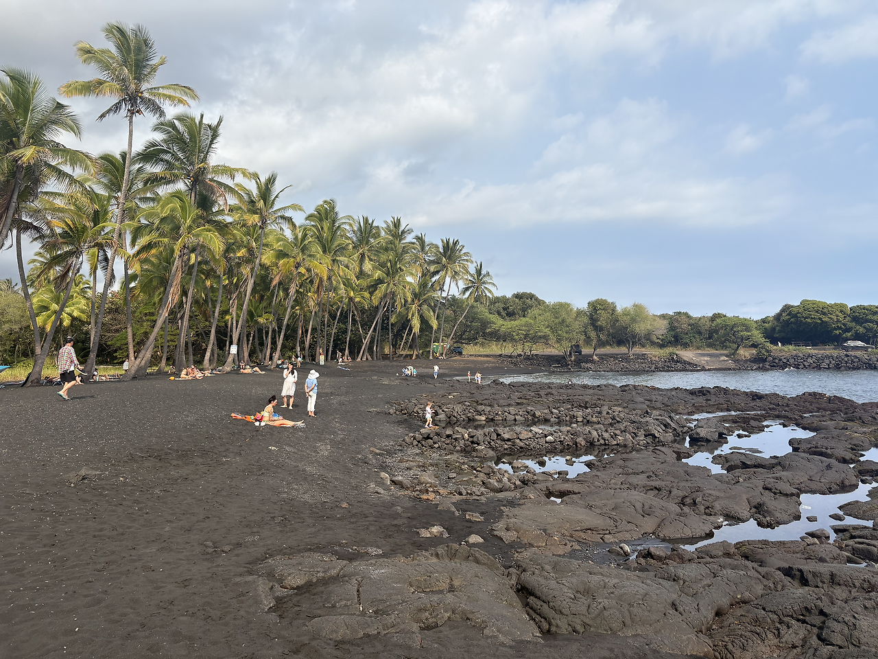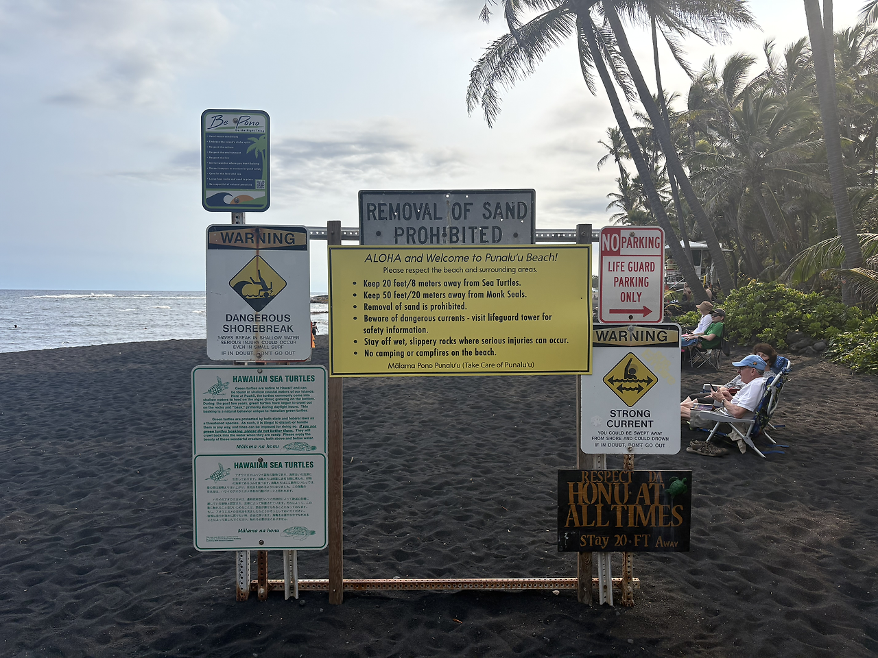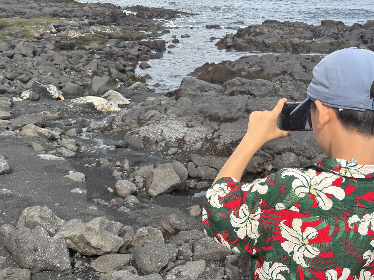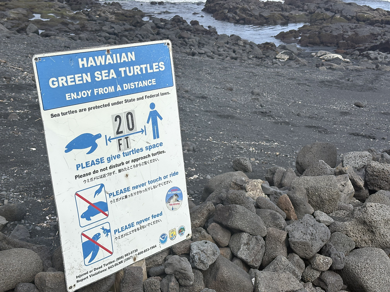 오늘의 마지막 여행지는 '푸날루 블랙샌드 비치(Punalu'u Black Sand Beach)'였다. 짙은 검은색 모래 해변은 너무나도 멋있었다. 화산 지형 특유의 검은 흙이 까칠까칠할 줄 알았는데, 아주 부드럽고 촉감이 좋았서 아이들이 너무나도 좋아했다. 몸에 잘 묻어나지도 않아 모래놀이를 하기에 최적의 환경이었다. 이 해변이 유명한 또 다른 이유는 바로 바다거북의 산란지이기 때문이다. 아니나 다를까, 해변에 접어들자마자 사람들이 모여서 사진을 찍고 있었다. 칼스미스 해변에서 만난 여유있게 헤엄치는 바다거북의 모습이 아닌, 말 그대로 검은 모래 해변에서 미동도 없이 일광욕을 하는 바다거북의 모습이었다. 자세히 보니, 거북의 등에 숫자로 관리번호를 적어 놓은 것을 확인할 수 있었다. 바다거북의 구역으로 만들어 놓은 곳 말고, 그냥 해변의 바다 속에서도 바다거북이 헤엄치는 모습을 만날 수 있었다. 정말 원없이 거북이를 보는 행복한 여행이었다.