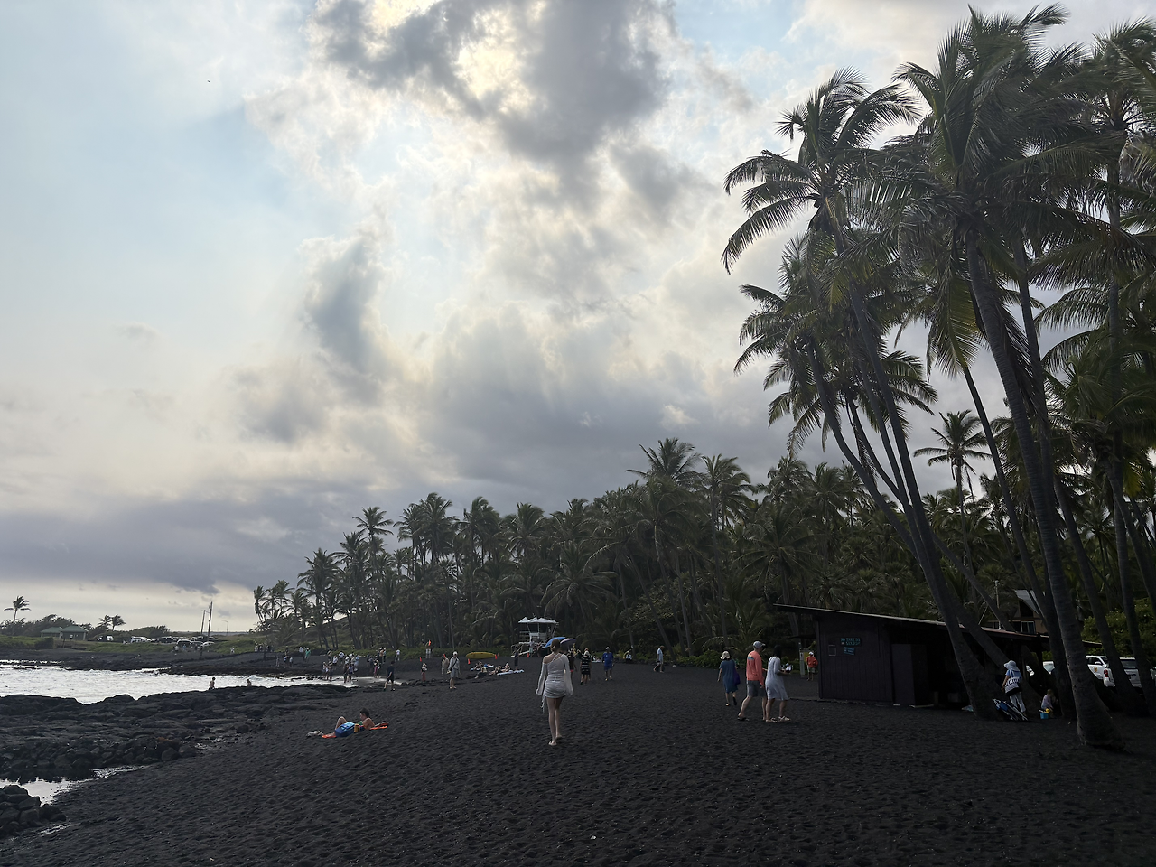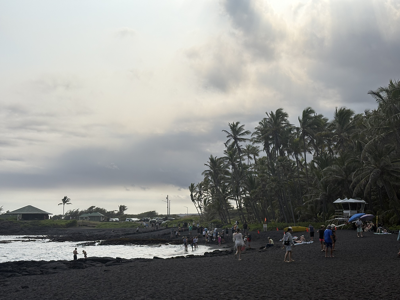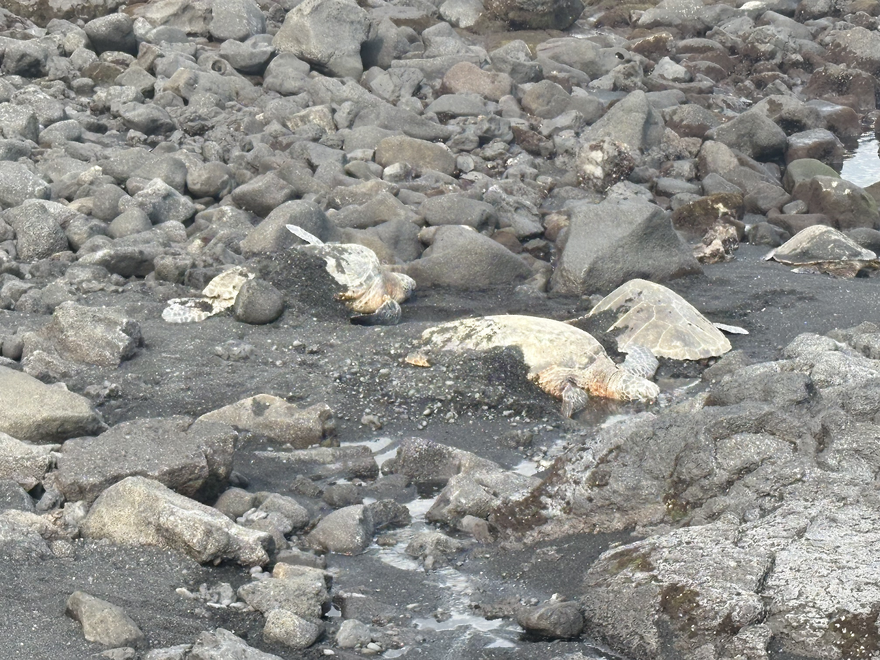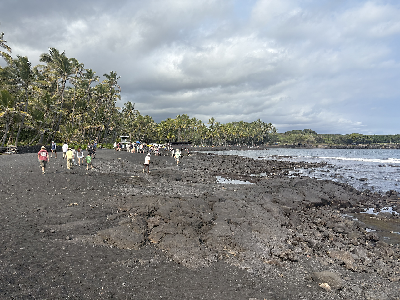 오늘의 마지막 여행지는 '푸날루 블랙샌드 비치(Punalu'u Black Sand Beach)'였다. 짙은 검은색 모래 해변은 너무나도 멋있었다. 화산 지형 특유의 검은 흙이 까칠까칠할 줄 알았는데, 아주 부드럽고 촉감이 좋았서 아이들이 너무나도 좋아했다. 몸에 잘 묻어나지도 않아 모래놀이를 하기에 최적의 환경이었다. 이 해변이 유명한 또 다른 이유는 바로 바다거북의 산란지이기 때문이다. 아니나 다를까, 해변에 접어들자마자 사람들이 모여서 사진을 찍고 있었다. 칼스미스 해변에서 만난 여유있게 헤엄치는 바다거북의 모습이 아닌, 말 그대로 검은 모래 해변에서 미동도 없이 일광욕을 하는 바다거북의 모습이었다. 자세히 보니, 거북의 등에 숫자로 관리번호를 적어 놓은 것을 확인할 수 있었다. 바다거북의 구역으로 만들어 놓은 곳 말고, 그냥 해변의 바다 속에서도 바다거북이 헤엄치는 모습을 만날 수 있었다. 정말 원없이 거북이를 보는 행복한 여행이었다.