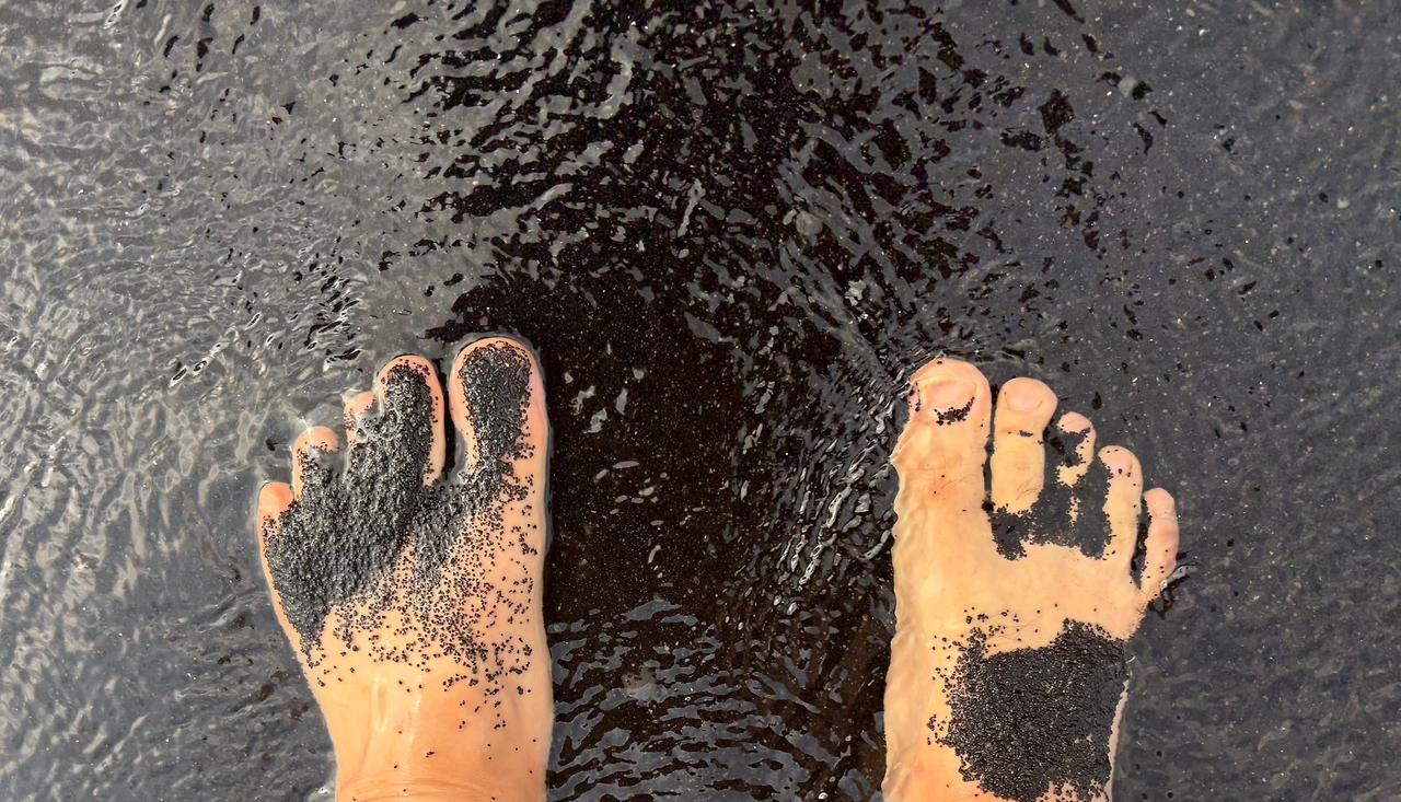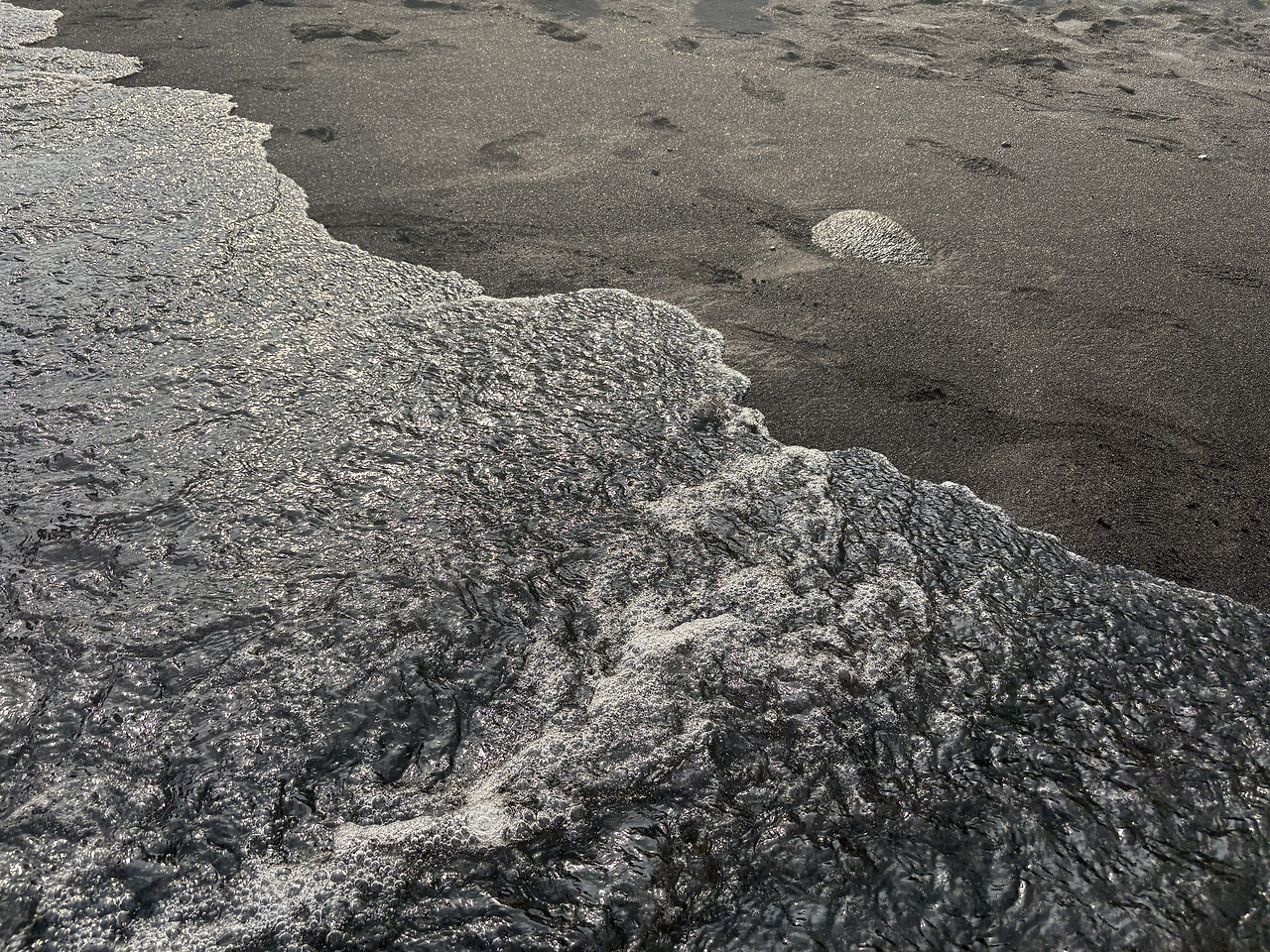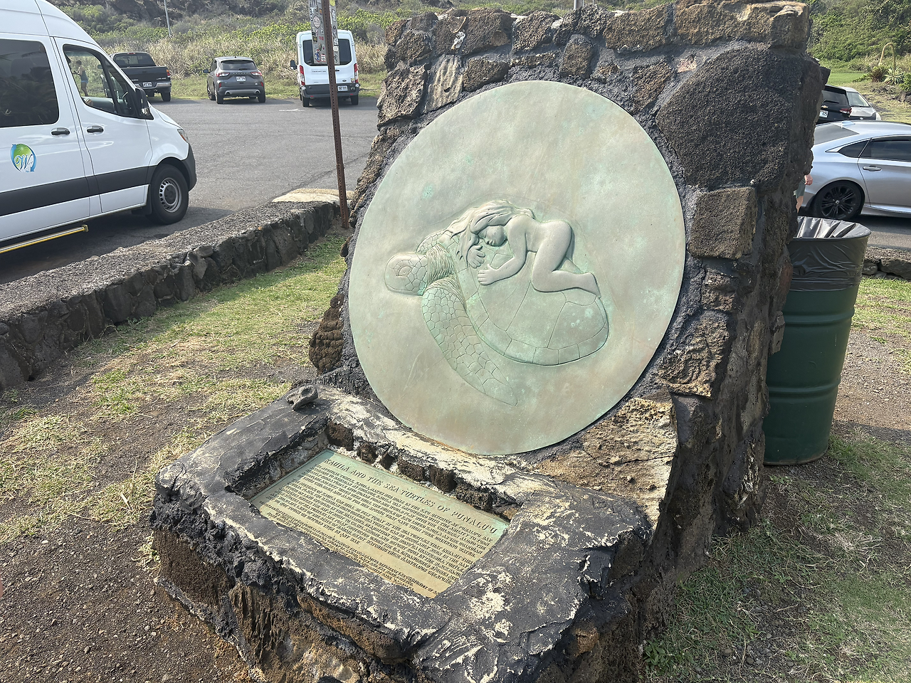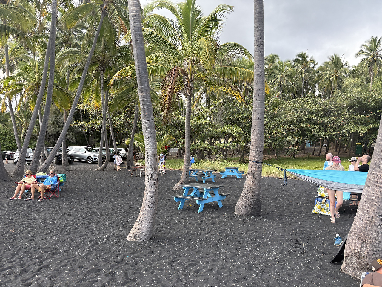 오늘의 마지막 여행지는 '푸날루 블랙샌드 비치(Punalu'u Black Sand Beach)'였다. 짙은 검은색 모래 해변은 너무나도 멋있었다. 화산 지형 특유의 검은 흙이 까칠까칠할 줄 알았는데, 아주 부드럽고 촉감이 좋았서 아이들이 너무나도 좋아했다. 몸에 잘 묻어나지도 않아 모래놀이를 하기에 최적의 환경이었다. 이 해변이 유명한 또 다른 이유는 바로 바다거북의 산란지이기 때문이다. 아니나 다를까, 해변에 접어들자마자 사람들이 모여서 사진을 찍고 있었다. 칼스미스 해변에서 만난 여유있게 헤엄치는 바다거북의 모습이 아닌, 말 그대로 검은 모래 해변에서 미동도 없이 일광욕을 하는 바다거북의 모습이었다. 자세히 보니, 거북의 등에 숫자로 관리번호를 적어 놓은 것을 확인할 수 있었다. 바다거북의 구역으로 만들어 놓은 곳 말고, 그냥 해변의 바다 속에서도 바다거북이 헤엄치는 모습을 만날 수 있었다. 정말 원없이 거북이를 보는 행복한 여행이었다.