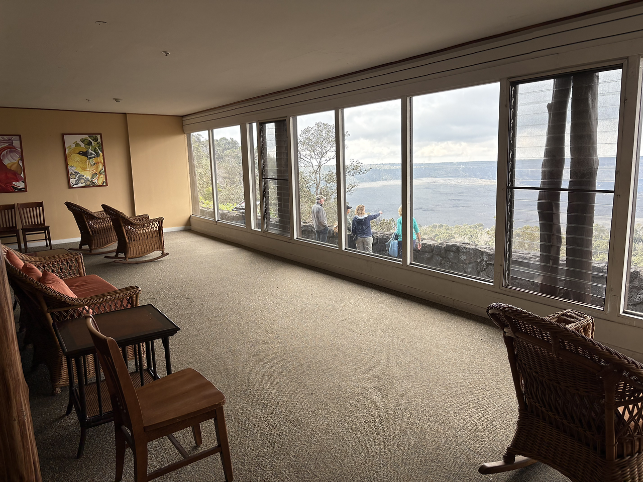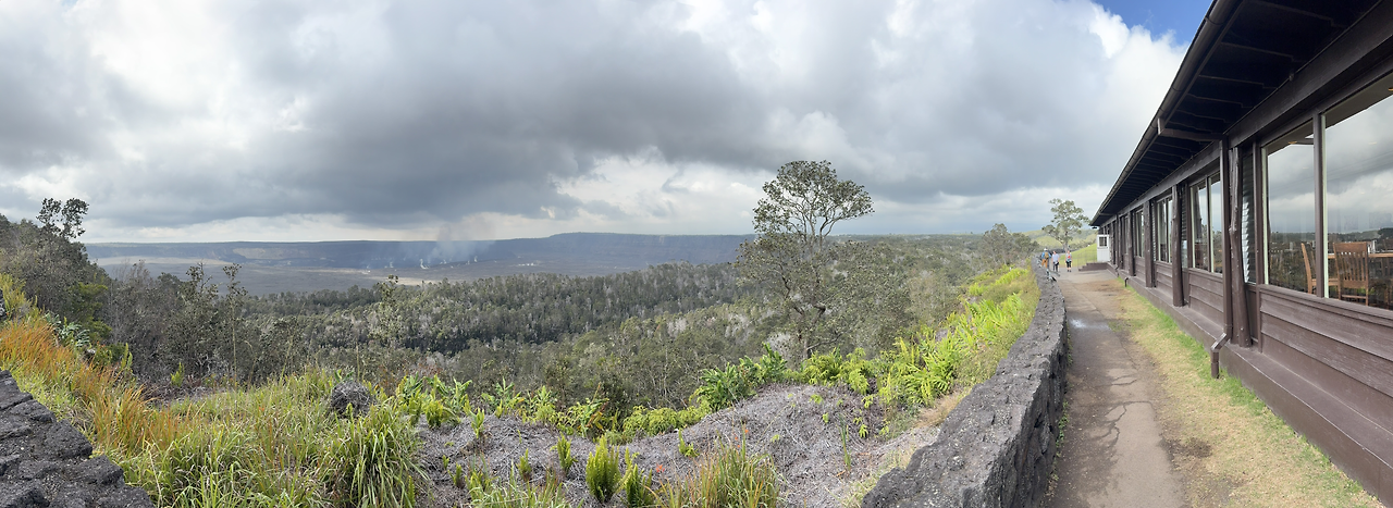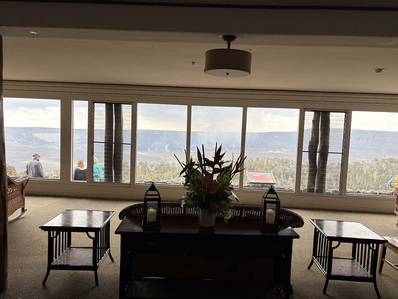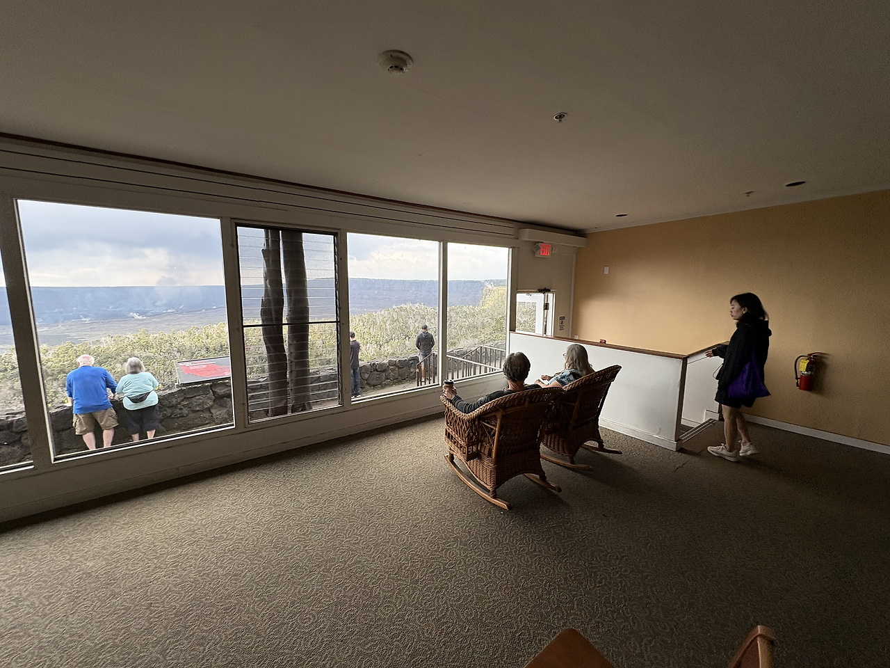 우리는 혹시나 하는 마음에 메인 전망대인 '볼케이노 하우스(Volcano House)'를 우선 방문하였다. 볼케이노 하우스는 방문자 센터 바로 옆에 있는 호텔이다. 볼케이노 하우스에 위치한 '더 림(The Rim)'이라는 이름의 레스토랑에서는 식사를 하면서 킬라우에아 분화구를 감상할 수도 있다. 호텔의 객실 역시 화산 분화구 뷰를 그대로 즐길 수 있다고 한다.