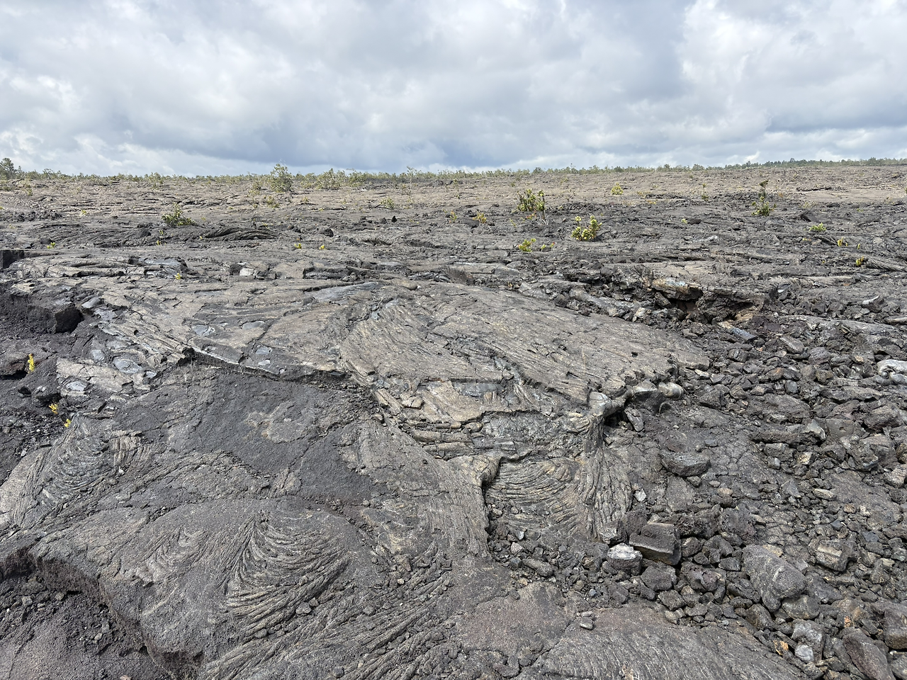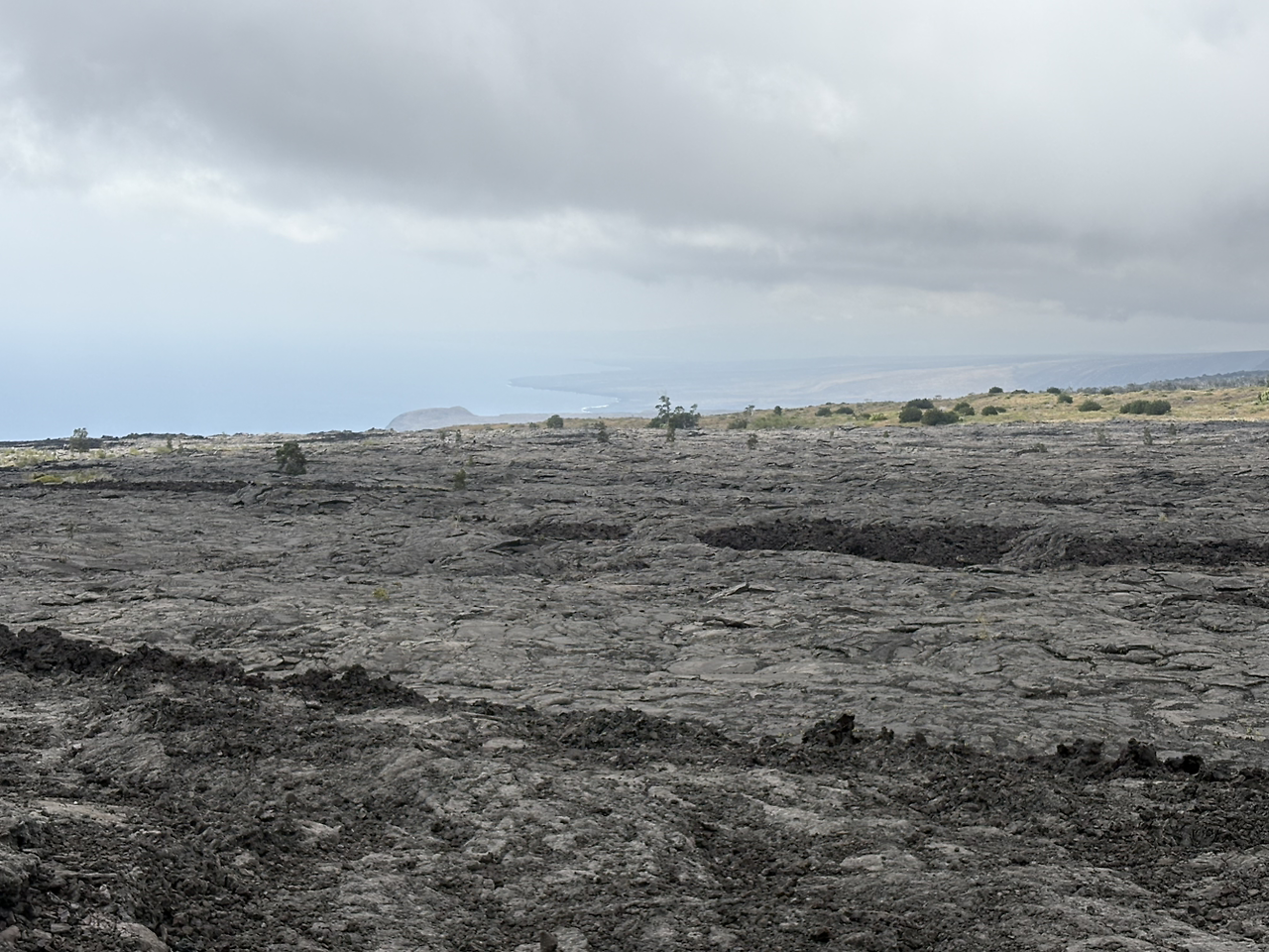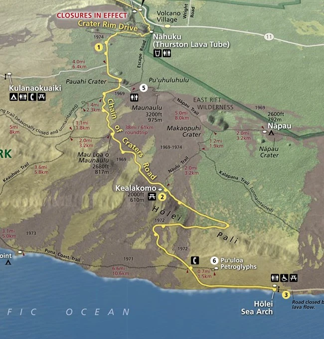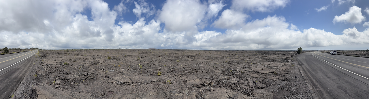 볼케이노 하우스에 화산의 진면목을 충분히 감상한 우리는 오늘의 메인 일정인 용암 지대 드라이브를 시작했다. '체인 오브 크레이터스 로드(Chain of Craters Road)'는 높이 1천미터 정도의 화산국립공원부터 완만한 곡선과 경사로 해안까지 이어진다. 이 길의 중간중간에는 전망대와 주차공간이 준비되어 있는데, 주요 장소들은 모두 화산활동의 흔적으로 분화구 또는 용암지대였다. 분화구 전망대에는 몇년도에 폭발했던 분화구인지, 용암 지대에는 해당 용암이 몇년도에 흘러내린 것인지 안내가 되어 있다.