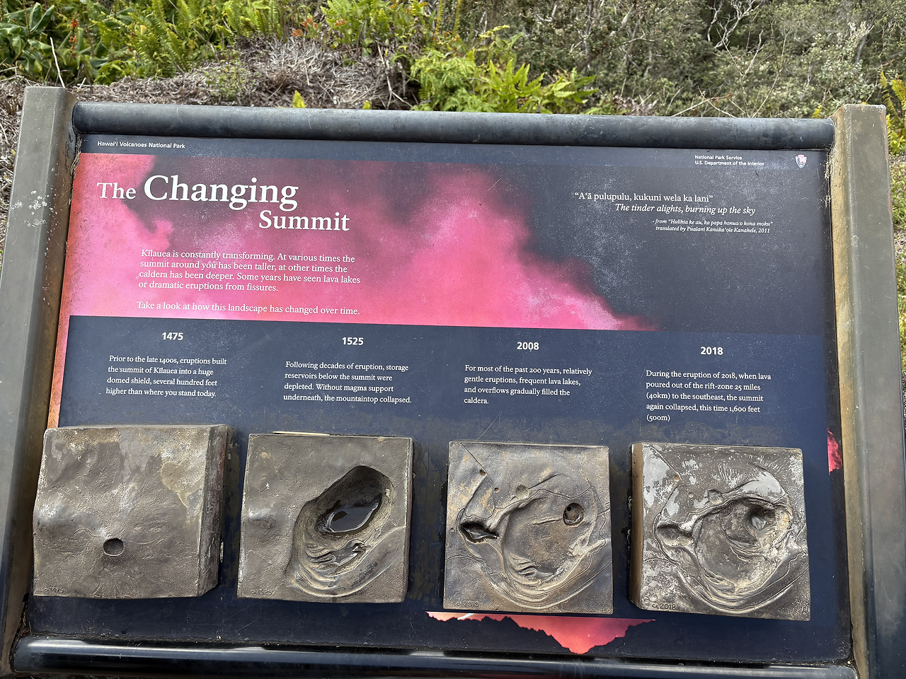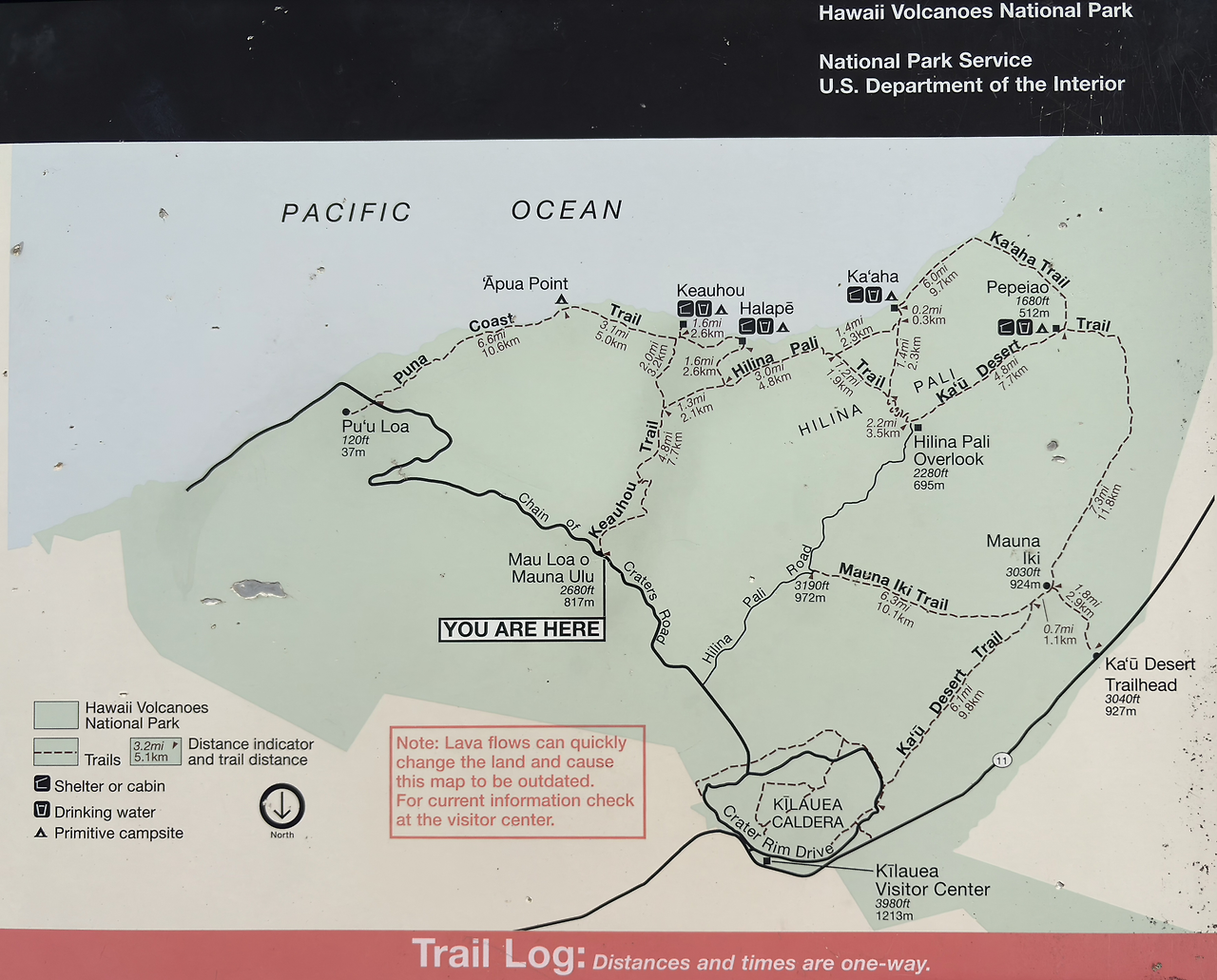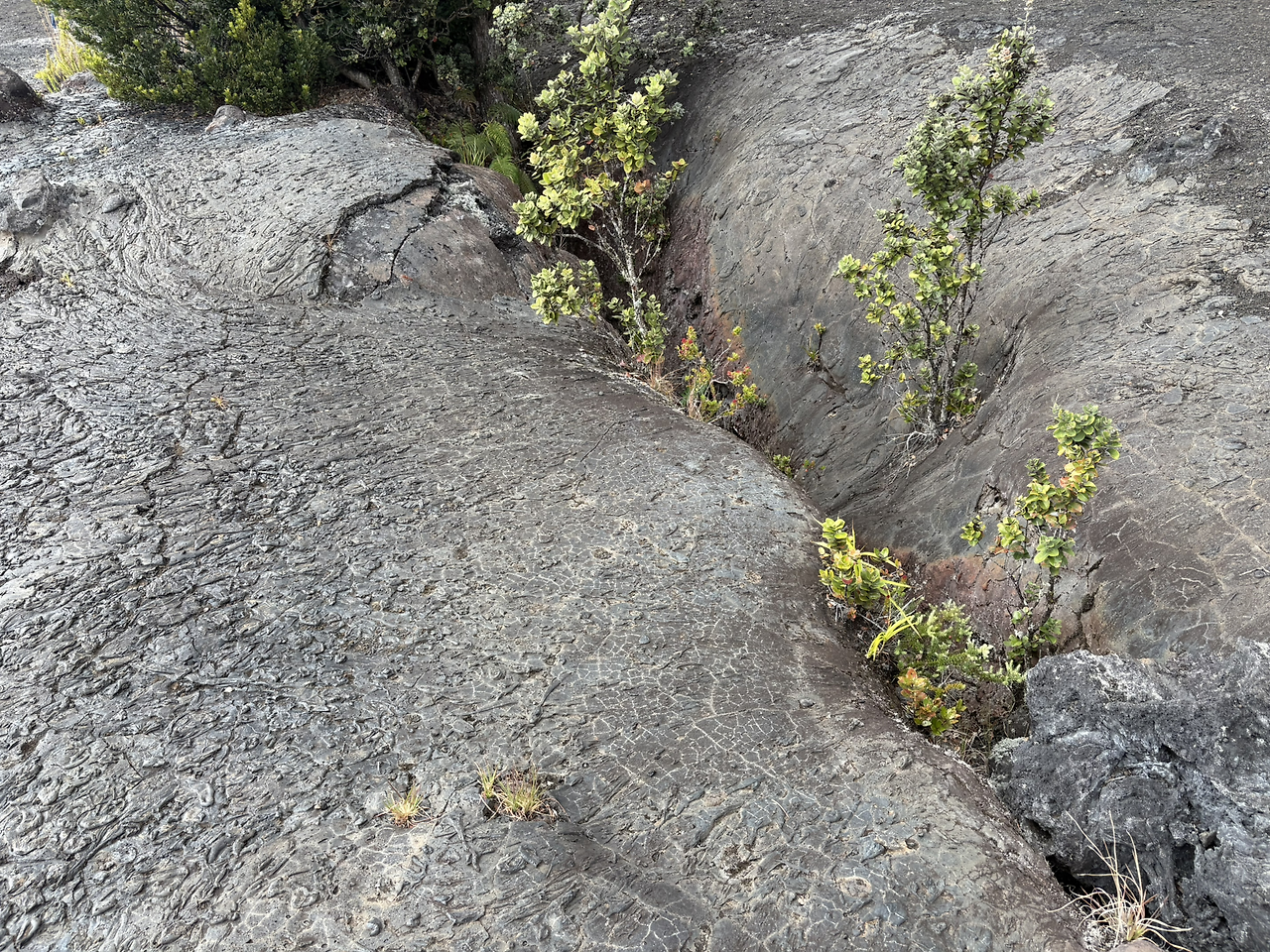 볼케이노 하우스에 화산의 진면목을 충분히 감상한 우리는 오늘의 메인 일정인 용암 지대 드라이브를 시작했다. '체인 오브 크레이터스 로드(Chain of Craters Road)'는 높이 1천미터 정도의 화산국립공원부터 완만한 곡선과 경사로 해안까지 이어진다. 이 길의 중간중간에는 전망대와 주차공간이 준비되어 있는데, 주요 장소들은 모두 화산활동의 흔적으로 분화구 또는 용암지대였다. 분화구 전망대에는 몇년도에 폭발했던 분화구인지, 용암 지대에는 해당 용암이 몇년도에 흘러내린 것인지 안내가 되어 있다.