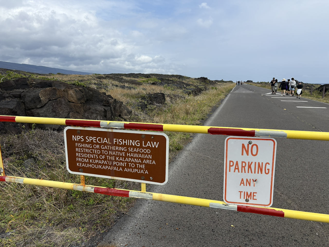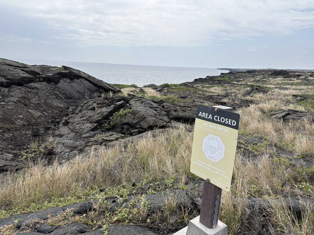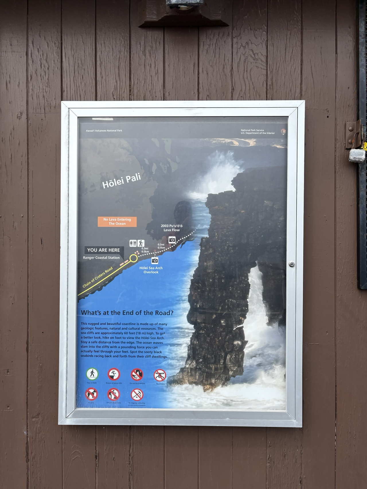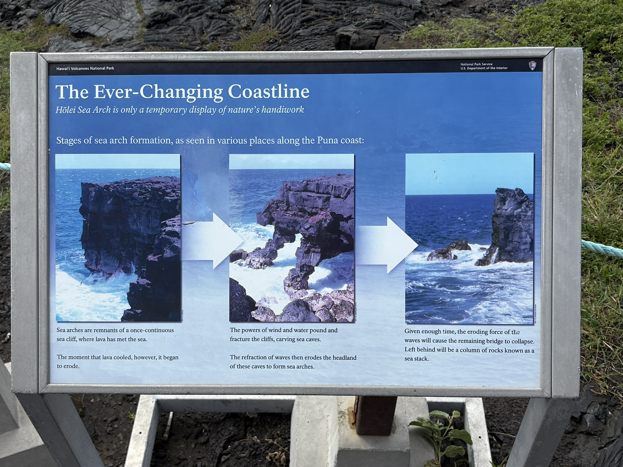이 길의 끝은 해변의 '홀레이 바다 아치(Holei Sea Arch)'로 이어졌다. 여행 책자마다 너무나도 아름다운 풍경이라고 소개하는 곳이라서 아내가 큰 기대를 하는 눈치였다. 원래는 도로로 쭉 이어져 있는 듯한데, 수년 전 있었던 푸우우오 분화구 폭발로 인하여 이 지역 인근이 용암으로 초토화된 이후에는 차량을 통행을 금지하고 있는 모양이었다. 한 5분 정도 걸으니, 바다 절벽 한 편에 아치 모양의 바위가 보였다. 엄청난 홍보에 비하면 생각보다 그 규모는 크지 않았다. 초등학생 아들은 독도의 촛대바위나 삼형제 굴바위와 비슷하다고 말했다. 그 표현이 딱 맞는 듯했다.
