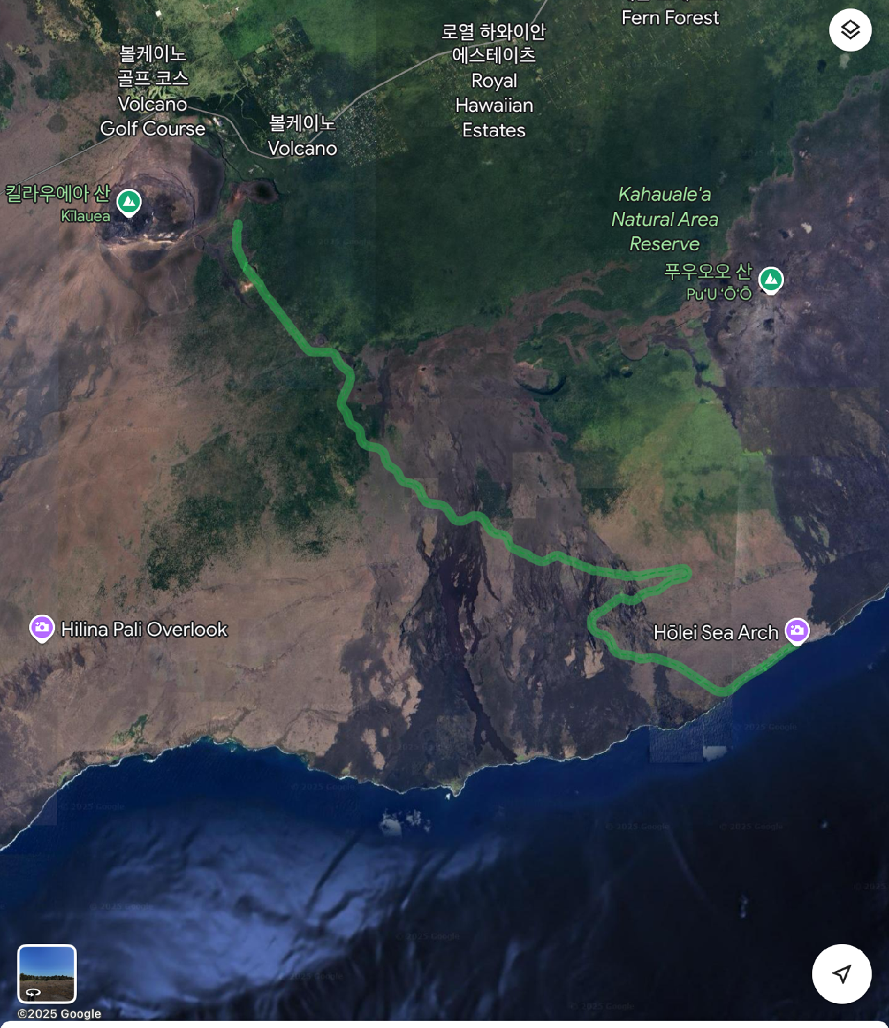 오늘은 다시 화산을 보러 가는 날이다. 국립화산공원의 입장권 유효기간 7일이 만료되기 전에 다시 방문하기로 한 날이 바로 오늘이었다. 오늘은 킬라우에아 분화구를 중심으로 둘러보는 것이 아니라, 용암의 흐름을 따라 해안까지 내려가는 '체인 오브 크레이터스 로드(Chain of Craters Road)' 길을 따라 화산을 체험하는 일정으로 계획하였다. 여러 분화구와 용암지대가 멋진 화산의 흔적을 만들어낸 곳으로, 하와이 빅아일랜드 여행을 한다면 반드시 가봐야 한다는 길이었다. 이 길을 따라 끝까지 내려가면 용암과 파도가 만들어낸 아름다운 절벽인 '횔레이 바다 아치(Holei Sea Arch)'가 기다리고 있다고 하여 너무 기대되는 하루였다.