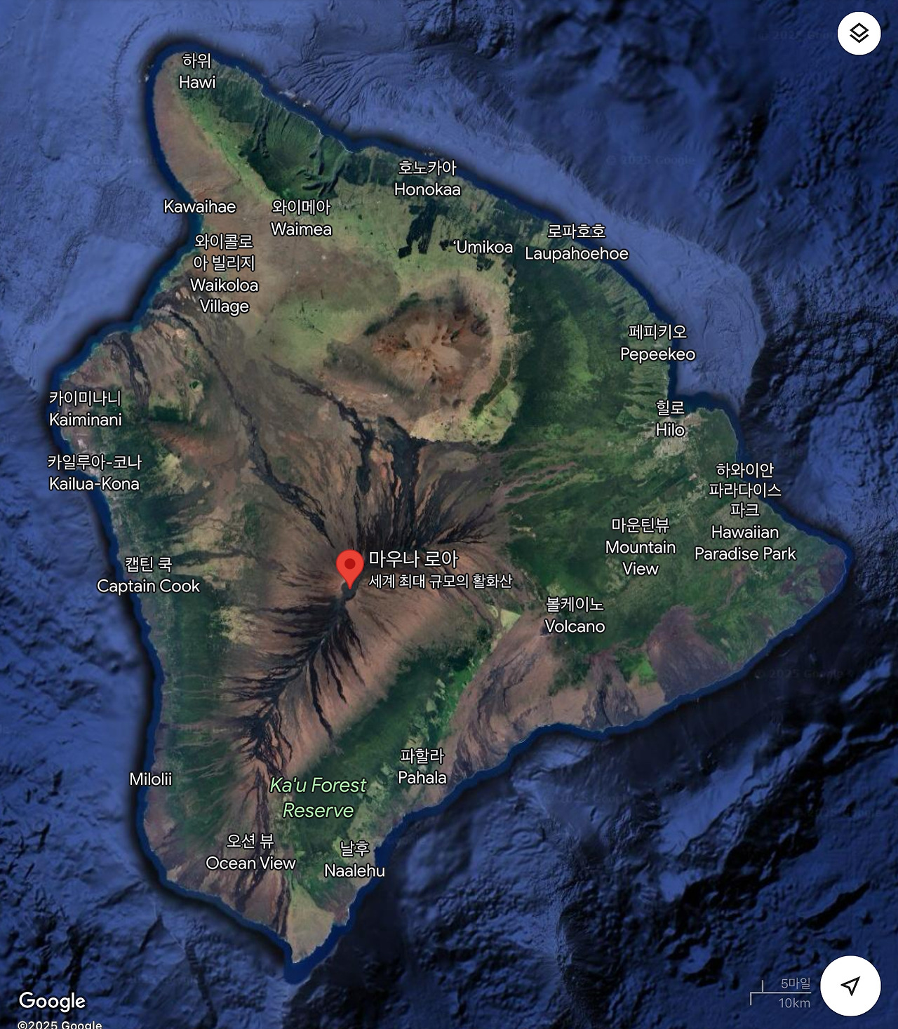 '섬의 중심에 가장 높은 산이 있으며, 남쪽으로 용암 지대가 펼쳐진다.' 이것이 내가 알고 있는 하와이 빅아일랜드의 지형에 대한 정보의 전부였다. 열흘 동안 차량을 직접 운전하며, 동서남북 지방을 짧게나마 모두 다녀보았다. 이후에 숙소에 돌아와서 운전을 하면서 보았던 풍경을 떠올리며 궁금했던 점들을 검색하여 채우는 방식으로 나름대로 지리 정보를 머리 속에서 정리하였다.