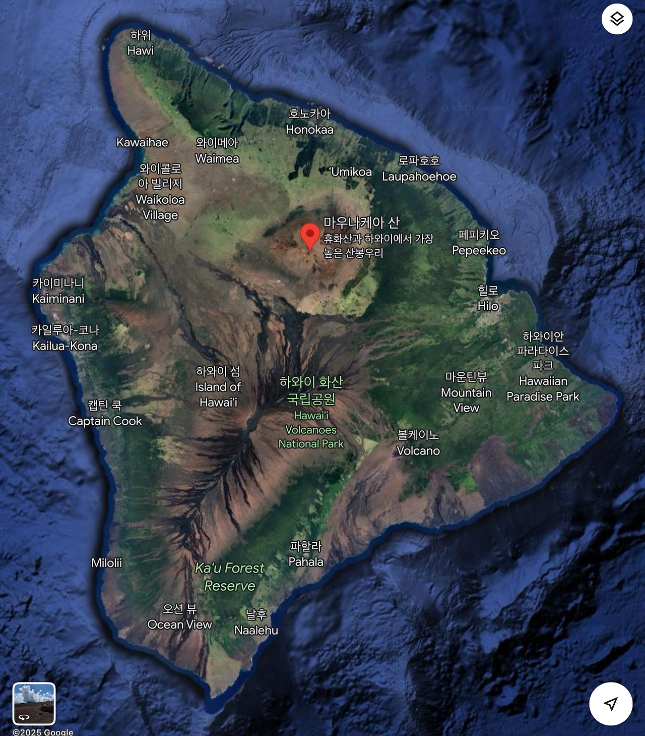 정상 부위는 좁은 봉우리가 아니라 넓게 펼쳐져 있는 고원이다. 세계에서 가장 높은 위치의 천문 관측소가 위치하고 있다. 세계 각국의 천체 연구진이 상주하며 별을 보고 있다. 우리 민족이 백두산을 민족의 영산이라고 표현하듯이, 하와이 빅아일랜드 섬의 원주민들에게 마우나케아는 아주 큰 의미를 주는 산이라고 한다. 내가 방문했던 2025년 2월 현재, 정상 부위에는 녹지 않는 눈이 하얗게 쌓인 모습이었다.