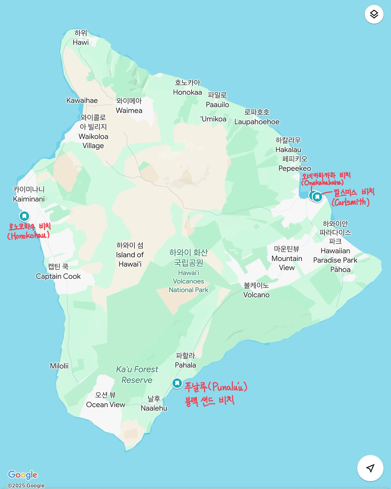 하와이 여행과 관련된 책자를 보면 거북이를 만날 수 있는 해변을 소개하는 내용이 있을 것이다. 내 경우에는 구글 지도에 달린 세계인들의 후기를 참고했다. 내가 운이 좋았던 것인지 몰라도, 거북이를 만나러 가야겠다고 찾아간 모든 해변에서 바다거북을 만날 수 있었다. 힐로 쪽 해변에서는 거북이가 보이지 않아 실망하고 그냥 스노클링을 하다 보니 내 눈 앞에 거북이가 헤엄을 치고 있어 깜짝 놀라기도 했다. 지구 상에 바다거북과 함께 수영을 할 수 있는 곳이 얼마나 많은지는 모르겠지만, 너무나도 특별하고 행복한 경험이었다. 내가 바다거북을 만났던 곳의 위치를 표시한 지도와 구글 지도 저장 위치를 공유해본다.