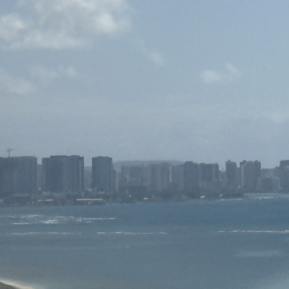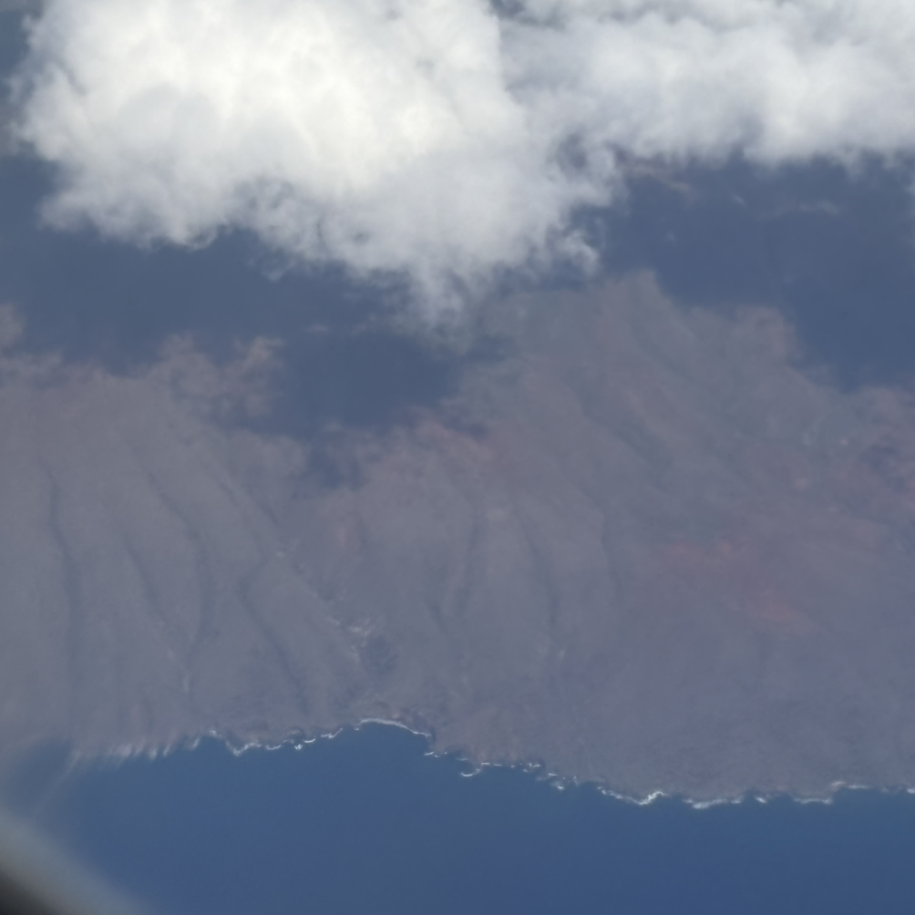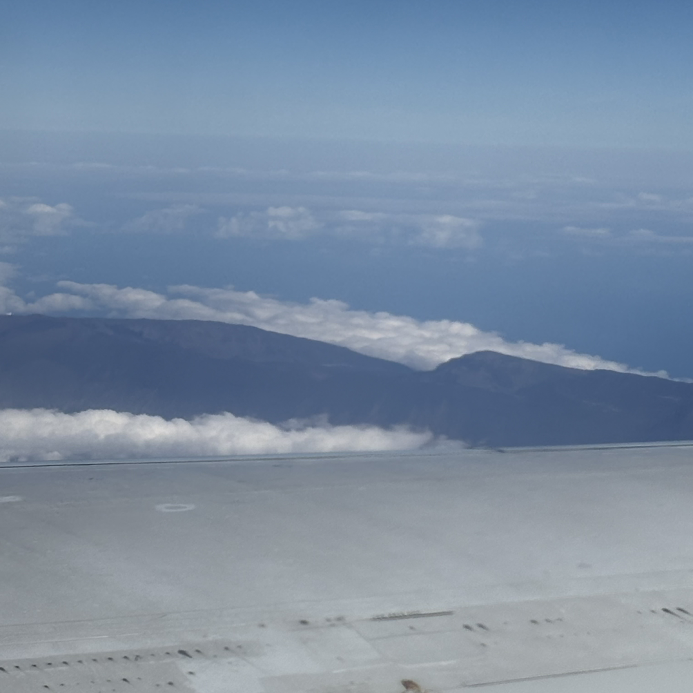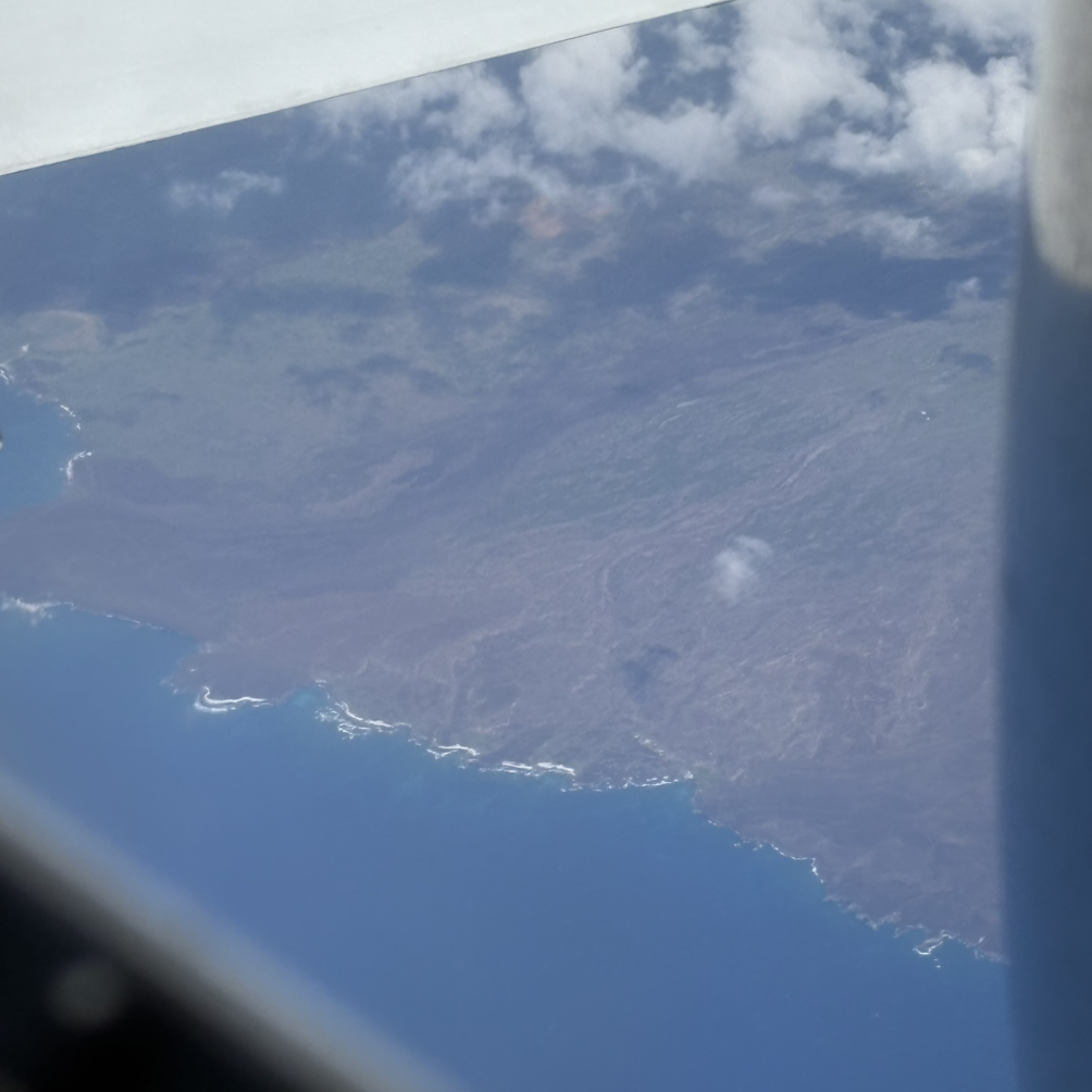 힐로로 오는 비행기에서는 시간도 어두운 밤이었지만, 엔진이 창 밖의 시야를 가리는 자리에 앉아서 풍경을 제대로 보지 못했다. 맑은 날씨에 창 밖으로 하와이 다른 섬들과 호놀룰루의 모습을 보고 싶어 기대했는데, 지난 번에 앉았던 자리와 거의 똑같은 위치에 배정받게 되어 창 밖을 제대로 볼 수 없었다. 고개를 숙이면 앞 자리의 창문으로 조금이나마 볼 수 있는 각도가 나와 불편한 자세로나마 하와이 주의 다른 섬들의 모습을 구경할 수 있었다.