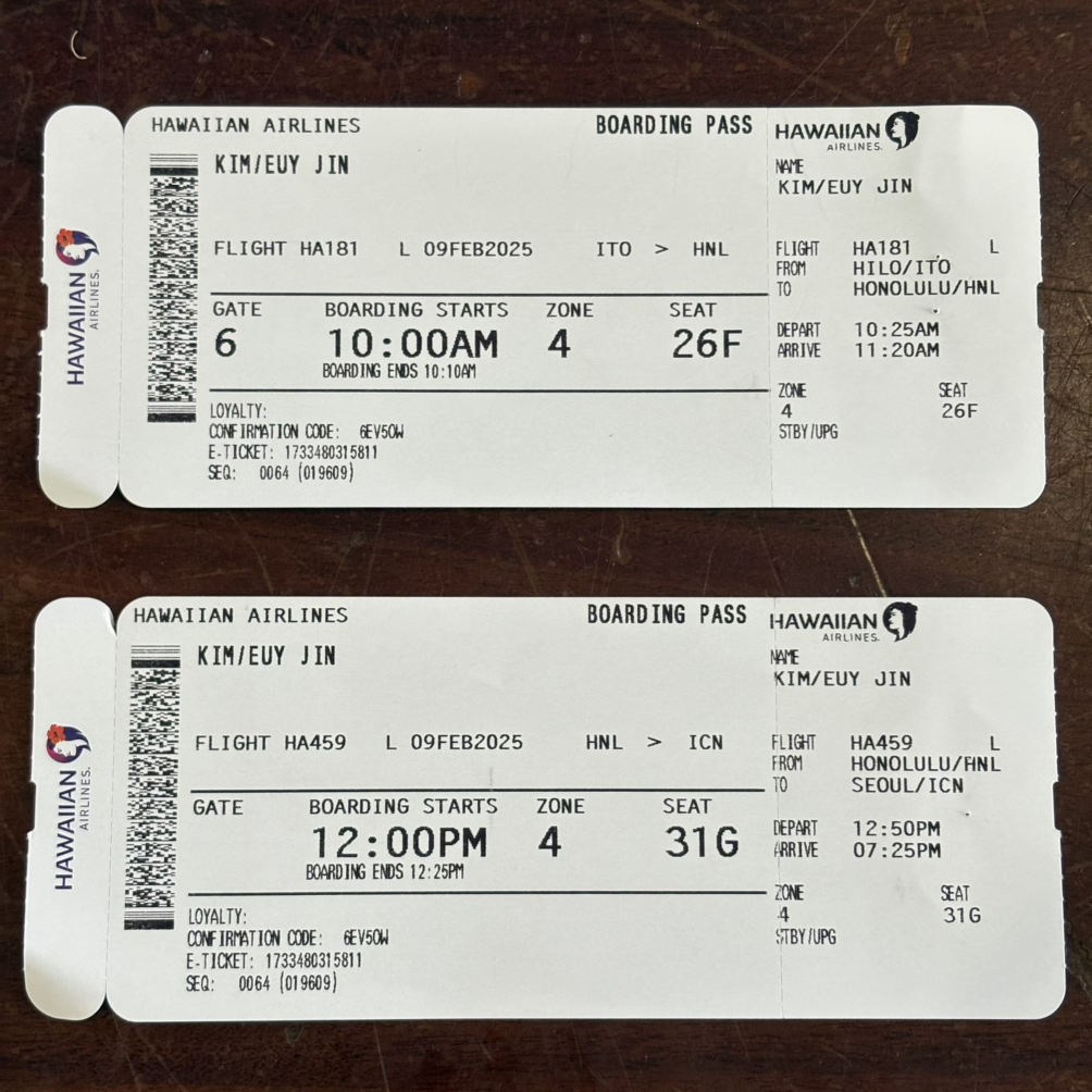 호놀룰루에서 인천까지의 비행에는 총 11시간 정도가 소요되었다. 인천에서 호놀룰루로 날아갈 때 8시간 정도가 소요된 것에 비하면 훨씬 더 오랜 시간이 걸렸다. 지구의 자전 방향과 이에 따른 공기의 흐름 덕분에 차이가 나는 것으로 알고 있는데, 참 신기한 일이다. 기억을 더듬어보니 십여 년 전 미국 서부의 시애틀 여행을 했을 때도 비슷한 경험을 했던 것 같다. 한 번의 식사와 두 번의 간식, 그리고 OTT 시리즈 2개의 시즌을 시청한 후 마침내 인천 공항에 착륙했다. 이번 여행은 내 인생 최고의 날들이었다. 장소도 시간도 날씨도 모든 것이 완벽했다. 사랑하는 가족들과 함께 지구가 살아있음을 느끼며 배우는 시간이었다. 남은 인생에 더 많은 여행을 하고 싶다는 생각을 하게 되었다. 나도 지구도 살아 숨쉬고 있어 감사하다.