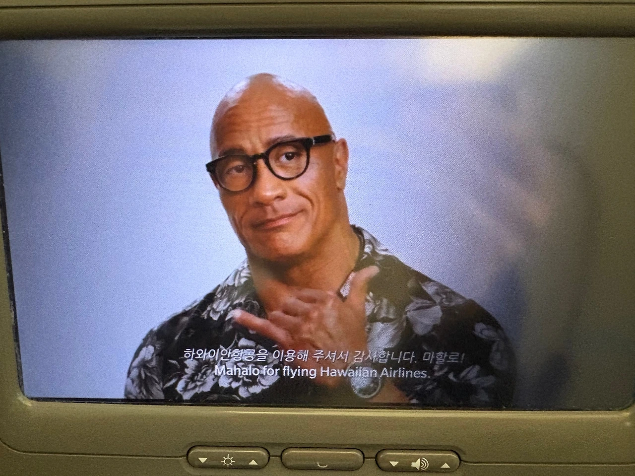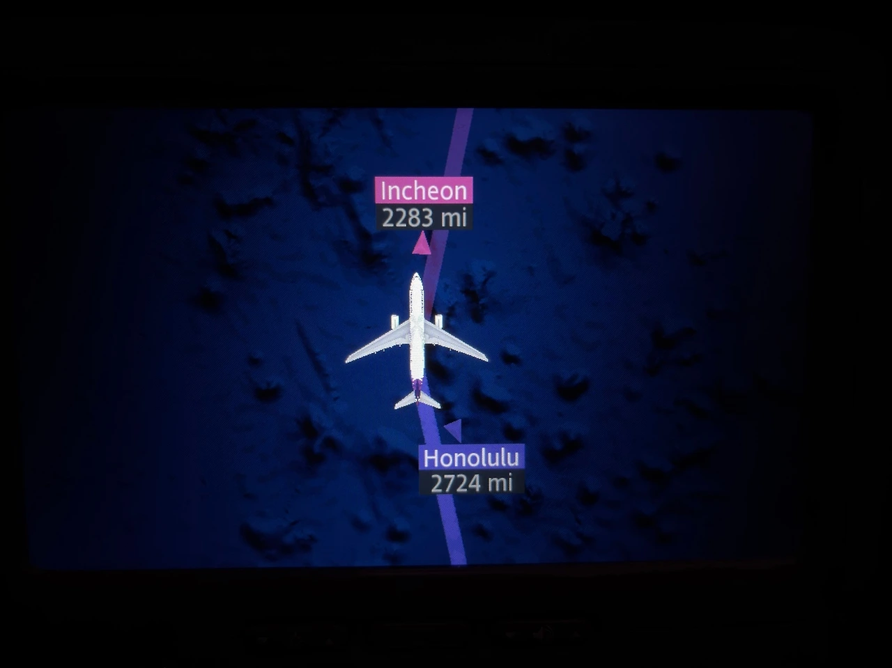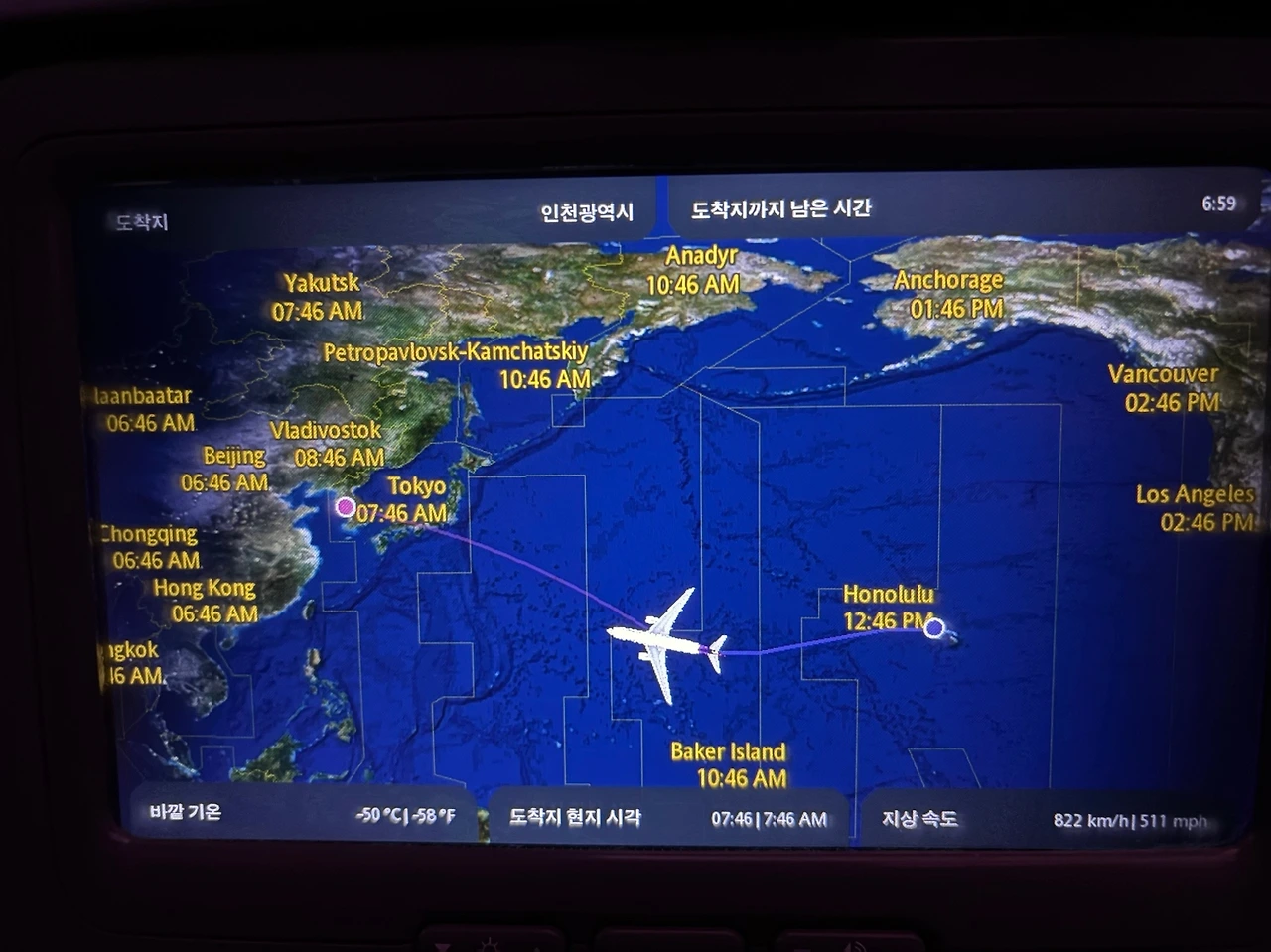 지구의 자전 방향을 거슬러서 가는 방향, 즉 인천에서 호놀룰루로 향하는 항공기의 비행 소요시간은 8시간 정도였다. 반대로 지구의 자전 방향대로 날아가는 방향, 즉 호놀룰루에서 인천으로 향하는 항공기의 비행 소요시간은 11시간 정도 걸렸다. 식사는 비행기가 출발하고 안정기에 접어들면 제공되는데, 치킨 라이스 또는 소고기 라이스 중 택일하는 형식이었다. 간식은 모두 2회 제공된다. 한 번은 파운드케익 한 덩이 정도로 가볍게, 마지막으로는 식사가 될 수 있는 수준의 샌드위치였다. 음료는 따뜻한 커피, 탄산음료, 맥주 등을 수시로 요청하여 마실 수 있다.