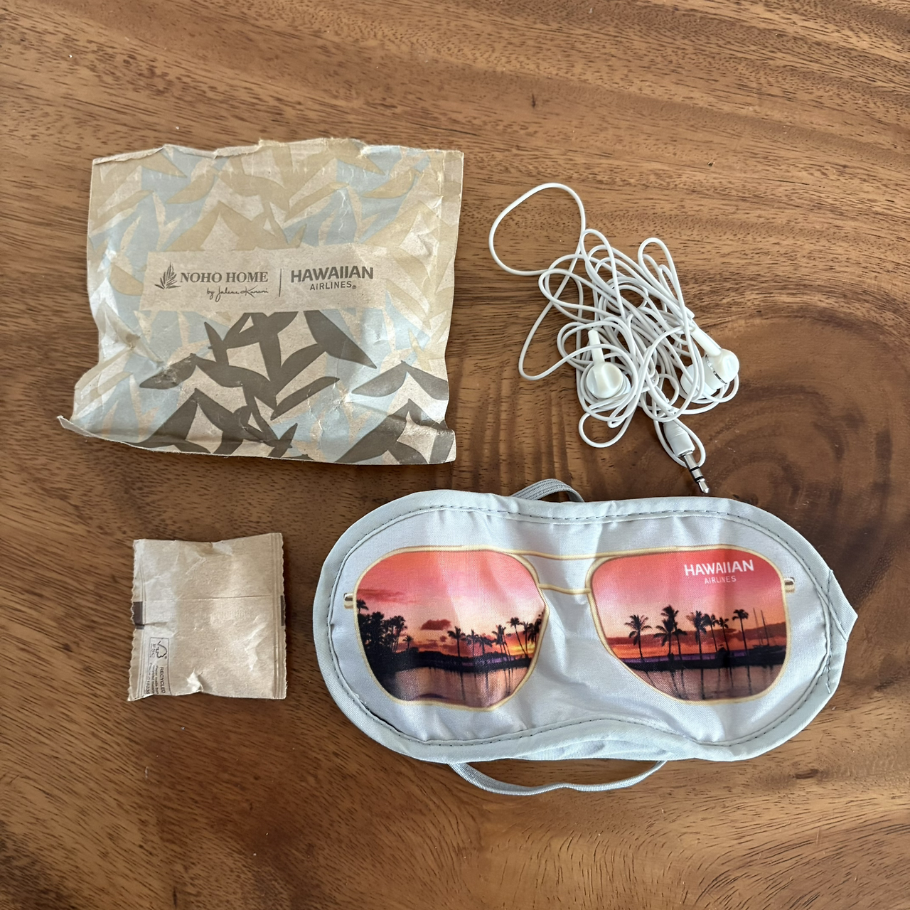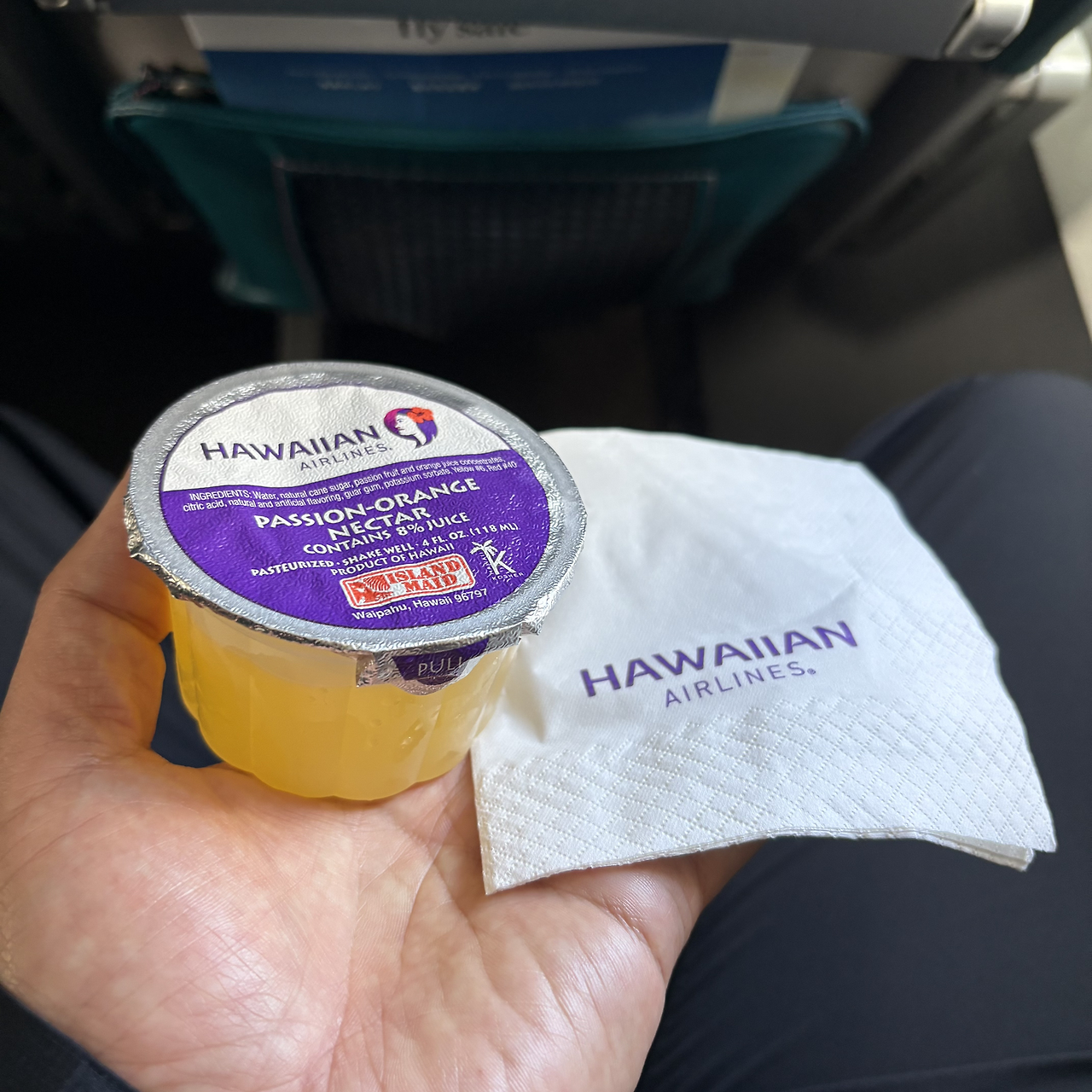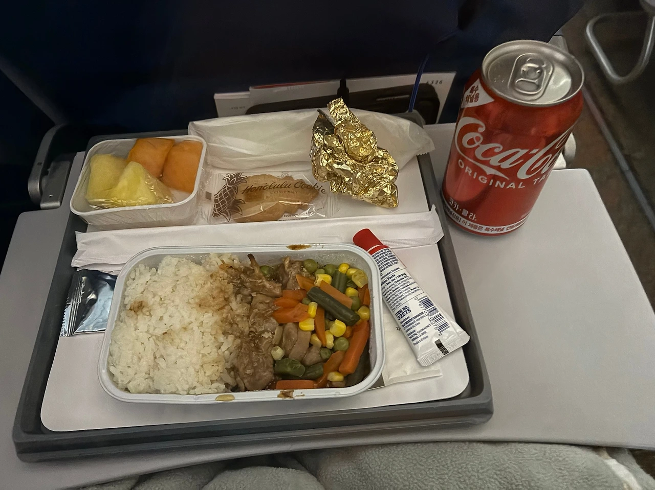 지구의 자전 방향을 거슬러서 가는 방향, 즉 인천에서 호놀룰루로 향하는 항공기의 비행 소요시간은 8시간 정도였다. 반대로 지구의 자전 방향대로 날아가는 방향, 즉 호놀룰루에서 인천으로 향하는 항공기의 비행 소요시간은 11시간 정도 걸렸다. 식사는 비행기가 출발하고 안정기에 접어들면 제공되는데, 치킨 라이스 또는 소고기 라이스 중 택일하는 형식이었다. 간식은 모두 2회 제공된다. 한 번은 파운드케익 한 덩이 정도로 가볍게, 마지막으로는 식사가 될 수 있는 수준의 샌드위치였다. 음료는 따뜻한 커피, 탄산음료, 맥주 등을 수시로 요청하여 마실 수 있다.