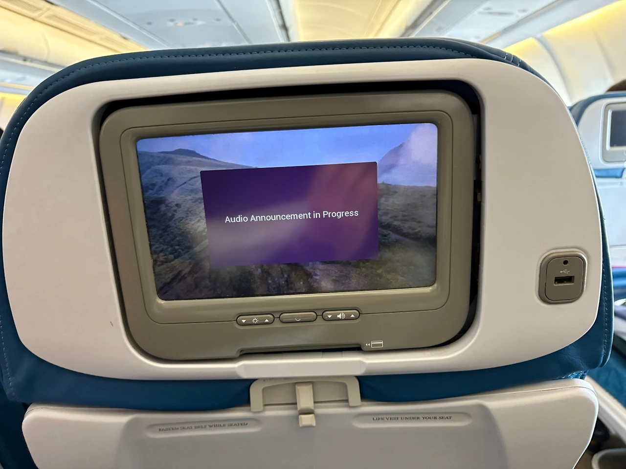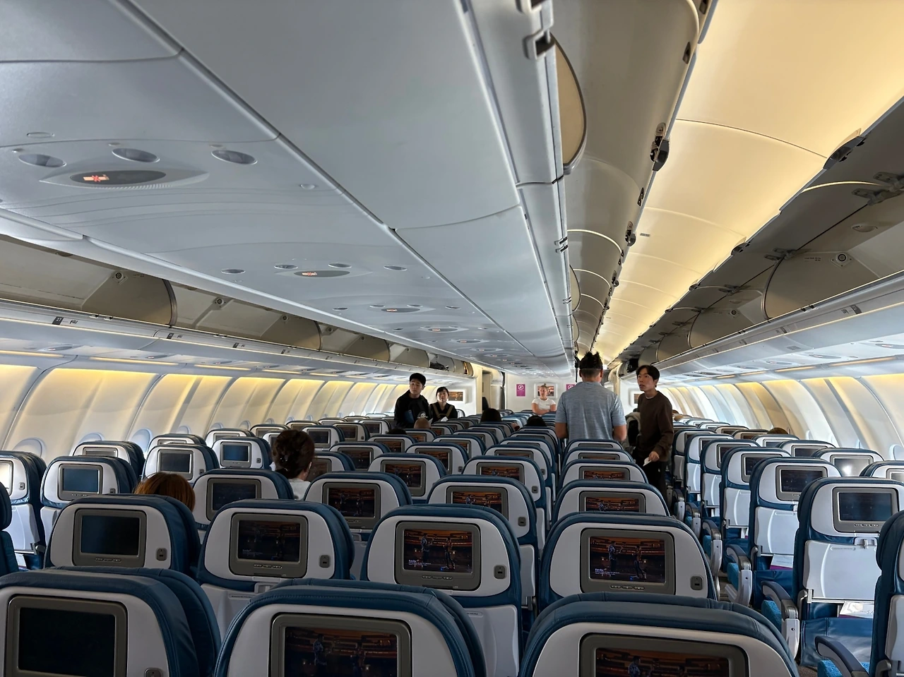 내가 탔던 항공편은 에어버스 A332 기종으로 400여명이 탑승하는 대형 항공기였다. 일반석은 좌석의 가로열 당 8석(2-4-2)을 기준으로 객석이 설치되어 있었다. 좌석별로 설치되어 있는 화면(AVOD)은 7~8인치 정도되는 화면으로 눈은 피로하지 않지만 그리 밝지는 않았고, 터치인식이나 반응이 좋은 편은 아니었다. 좌석별 충전 단자는 USB-A 형태로 제공되어, USB-C 케이블만 준비해 온 사람은 사용할 수 없었다. 개인별로 지급되는 물품은 배개, 담요, 물품 키트(안대, 이어폰, 귀마개 등)가 있었다. 비행기 연식에 비하여 좋았던 점은, 기내 Wi-Fi 이용이 쾌적했다는 사실이다. 많은 사람들이 OTT 앱 안에 오프라인 시청이 가능하도록 다운로드를 받아오는 것이 일반적인데, 넷플릭스나 디즈니플러스와 같은 대부분의 앱에서 스트리밍으로 영상을 시청할 수 있는 수준의 인터넷 사용 환경이 제공되고 있었다.