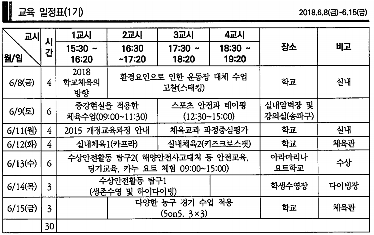 돌아보니 저 당시에는 뉴스포츠를 소개하는 내용이 많았다. 직무연수가 시대상을 반영한다는 이야기를 다시 한 번 눈으로 확인할 수 있었다. 각 프로그램을 세부적으로 들여다보면 강의로만 구성된 시간은 절반 이하였고, 절반 이상의 내용이 신체활동을 하면서 참여하는 것이었다. 뉴스포츠 중심의 연수에서는 새로운 내용을 지도하기 위하여 직접 체험해 보는 것이 중요했을 것이다. 전통적인 스포츠 지도법과 관련된 연수에서는 깊이있는 경험을 할 수 있도록 세부적인 내용이 구성되었었다.