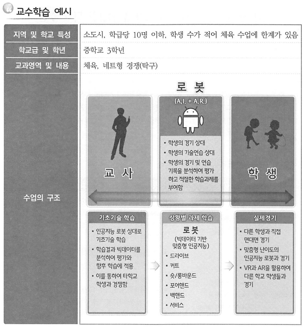 미래학교 연구학교에 근무하면서 다양한 방식의 수업을 하고 있었음에도 불구하고, 편협한 생각을 가지고 있던 내가 한 없이 부끄러웠다. 가상현실(V.R.)이나 증강현실(A.R.) 기술을 활용한 스포츠 경험은실제 스포츠가 아닌 단순한 체험에 불과하기 때문에 교육적 가치는 크지 않다고 생각하던 시기였다. 그런데, 완벽하지는 않더라도 실제를 전혀 경험해 볼 수 없는 학생들에게는 테크놀로지를 활용한 수업이 소중한 경험이 될 수 있다는 것을 깨닫게 된 것이다. 선배님의 조언에 따라, 지금 보다 훨씬 발전해 있을 미래의 테크놀로지 수준을 가정하여, 로봇과 증강현실을 융합하여 원거리에 있는 다른 학교 학생과 함께 경기를 하는 상황을 상상하며 내용을 구성했었 다. 한 없이 부끄러운 내용이지만, 그 내용은 다음과 같이 요약할 수 있다.