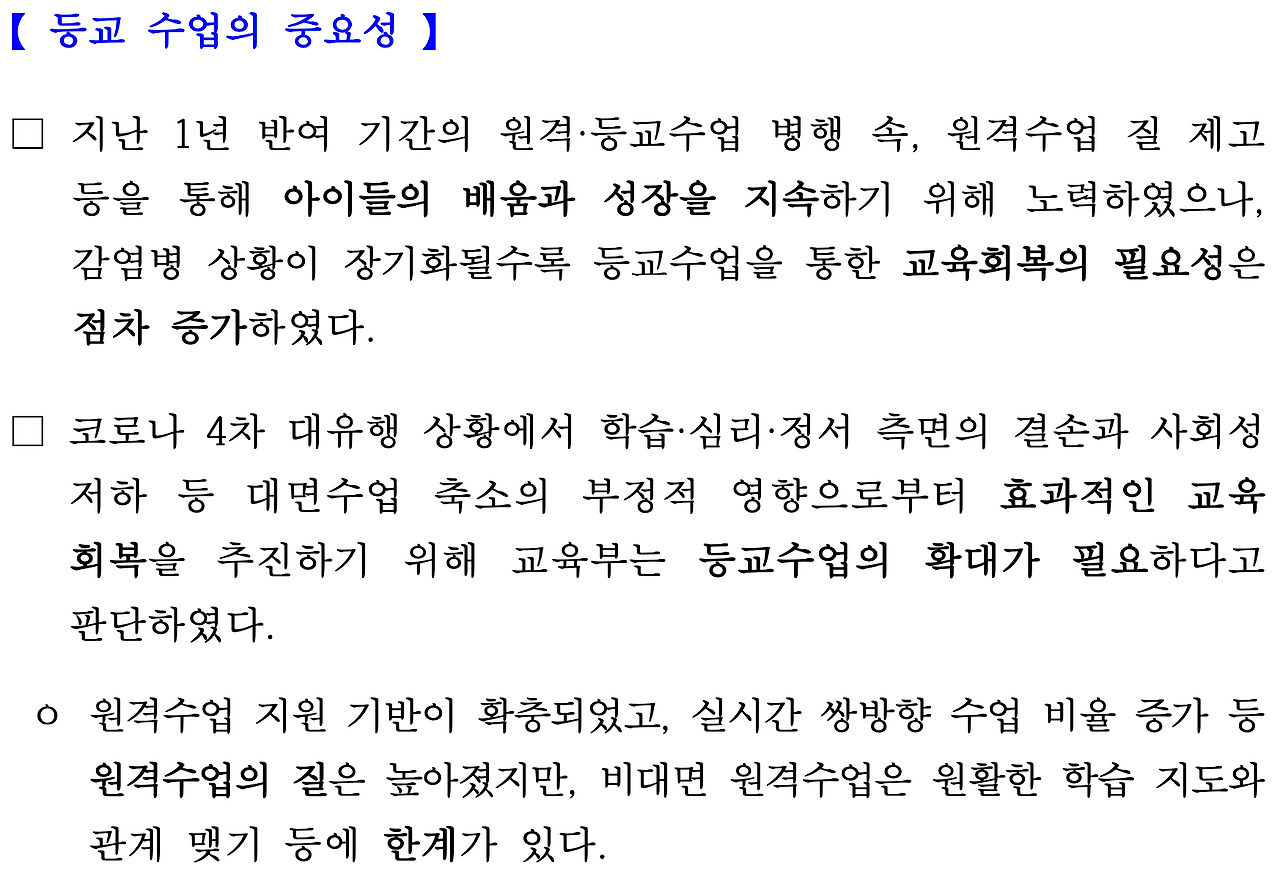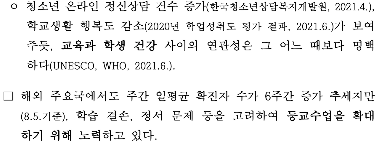 2021학년도 2학기, 대한민국 수도권 소재 학교들은 사회적 거리두기 4단계에도 전면적으로 등교 수업 확대에 나섰다. 사회적 거리두기를 위하여 학생들을 학교에 모이지 않게 하는 것보다, 학생들이 학교에 가서 교육을 받는 것이 더 중요하다는 판단을 한 것이다. 어린 나이의 아이들에게 학교는 어떤 의미를 가지고 있기에 학교 교육의 정상화를 위해 국가적 역량을 총동원하겠다는 선언을 하게 된 것일까.