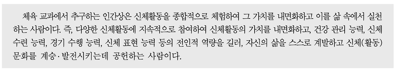 체육은 그 단어의 의미부터 본질적으로 몸(體)을 다루고 있으며, 초중등 교육의 필수 교과 중 유일하게 신체활동 그 자체가 목적인 교과이다. 하지만, 단순히 건강한 육체를 만드는 것만으로 체육 교육의 목적을 달성했다고 만족하기는 어렵다. 우리의 몸은 마음, 정신과 따로 떼어서 생각할 수 없으며, 신체활동이라는 것은 필연적으로 다른 사람과의 상호작용을 가져오기 때문이다. 그래서 우리나라 학교 교육에서는 체육 교과가 궁극적으로 이루고자 하는 인간상을 다음과 같이 표현하고 있다.