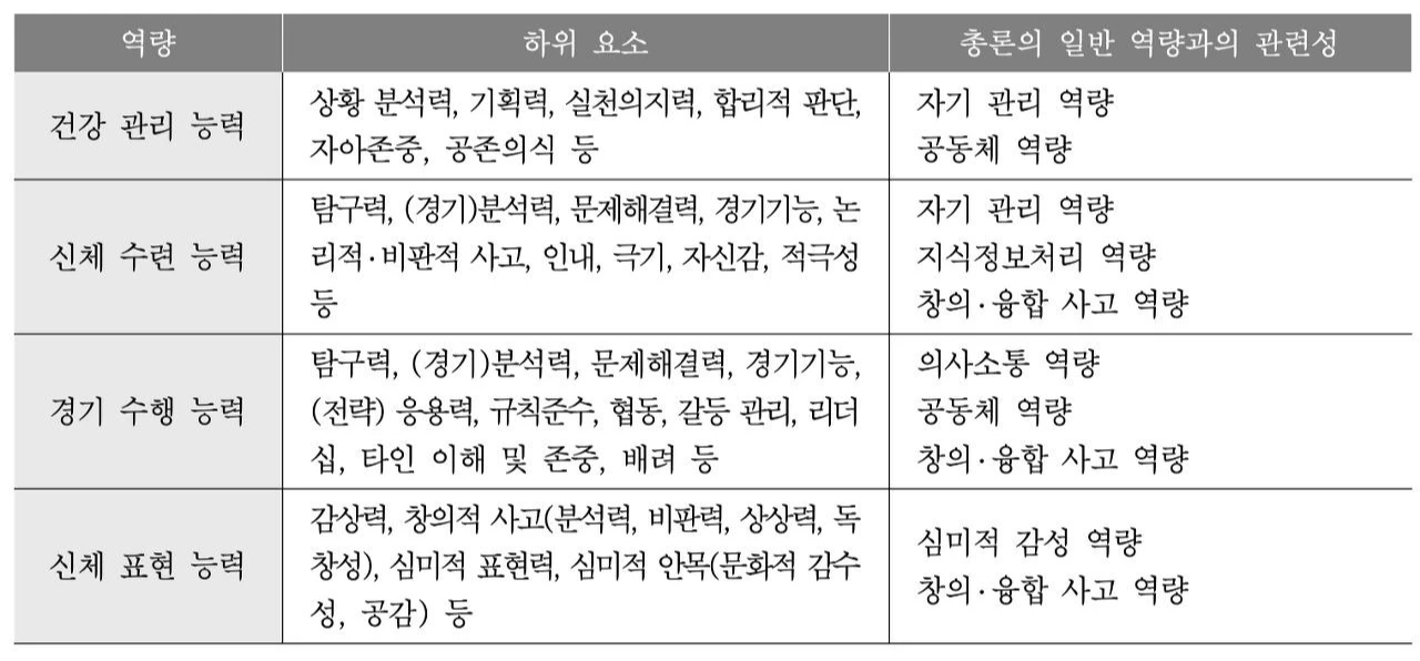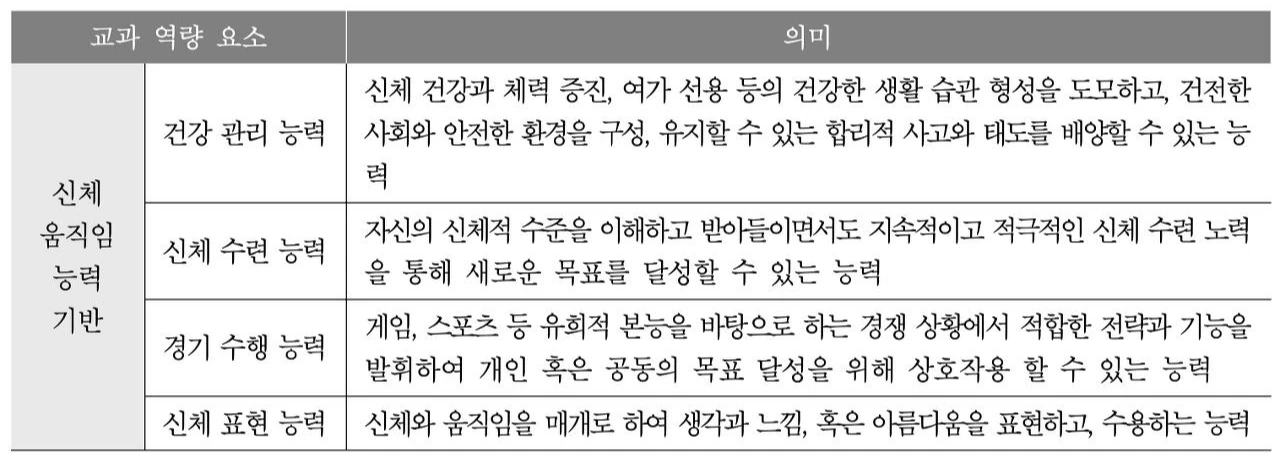 학교 교육은 정규 수업시간, 그러니까 시간표로 표현되는 정규교육과정이 핵심이다. 현재는 정규교육과정 외 교육활동이 사실 상 멈추어버린 코로나 확산 국면에서, 정규 교과 수업의 내실화가 더욱 중요한 상황이기도 하다. 역량 중심 교육과정으로 구성되어 있는 '2015 개정 교육과정'에서 체육 교과에서 길러주고자 하는 역량은 다음과 같다.