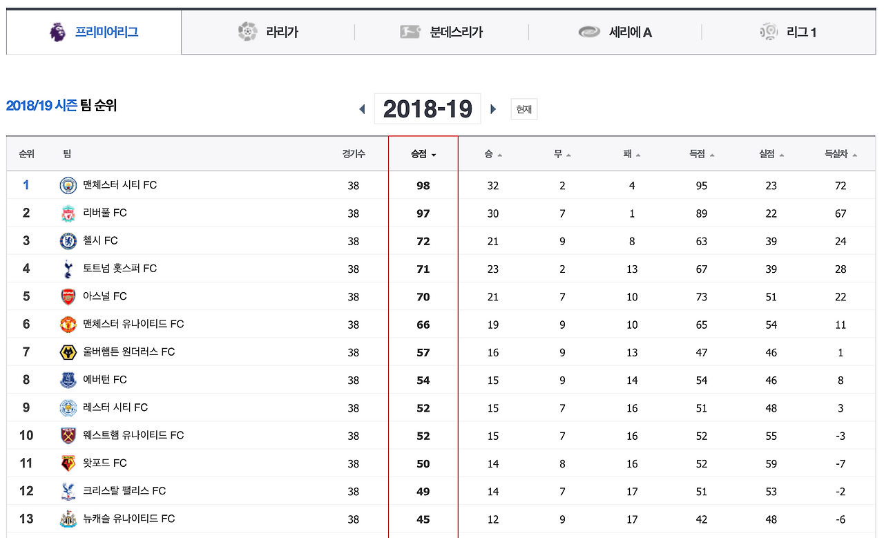 잉글랜드 프리미어리그의 강호 리버풀은 2018-2019 시즌에 승점 97점을 기록하며 최종 순위 2위를 기록했다. 리버풀이 2위를 했다고는 하지만, 이 시즌의 리버풀이 2015-2016 시즌에 승점 81점으로 리그 우승을 차지한 레스터 시티보다 경기력이 떨어지는 팀이었다고 생각하는 축구팬은 없을 것이다. 직전 10여년 동안 80점대 후반의 승점을 기록하면 리그 우승이 가능했지만, 유독 이 시즌은 승점 98점의 맨체스터 시티가 있어 우승을 차지하지 못한 것이기 때문이다. 더 세부적으로 데이터를 들여다보면, 우승을 차지한 맨체스터 시티가 4패를 기록한 반면에 리버풀은 1패밖에 기록하지 않은 사실도 확인할 수 있다. 더군다나 이 시즌의 리버풀은 유럽 챔피언스리그에서 우승을 차지할 정도로 놀라운 경기력을 보여주었다. 2019-2020 시즌에 승점 99점을 기록하며 우승한 리버풀보다 2018-2019 시즌의 리버풀이 위대한 팀으로 기억되는 이유가 바로 여기에 있다.