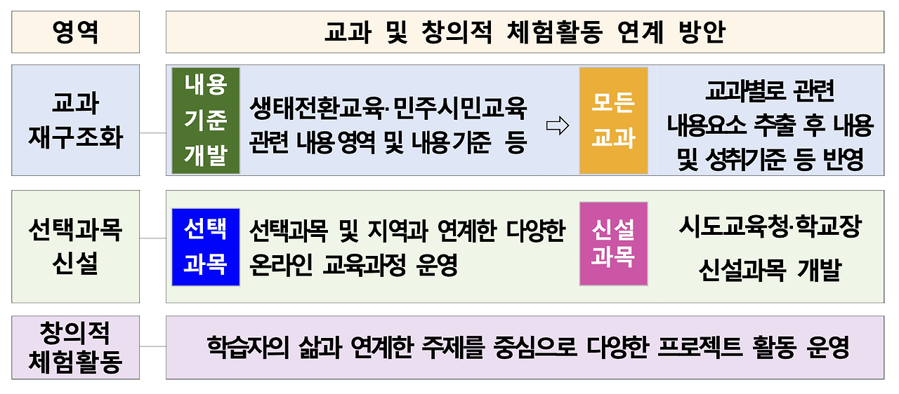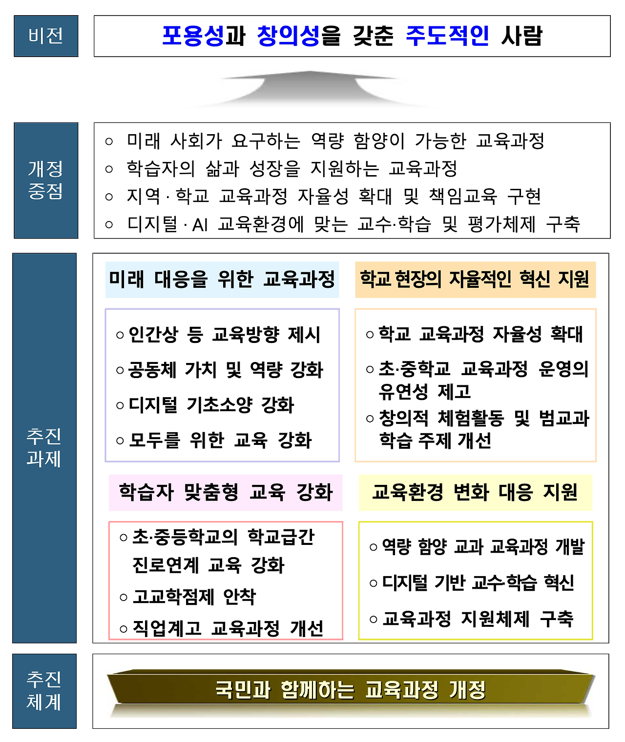 위의 그림에서 설명하고 있는 '국민과 함께하는 교육과정 개발 체제'를 통한 사회적 합의를 통하여 도출된 교육과정 개정 관련 주요 의견과 결정된 개정 방향은 다음 그림과 같다.
