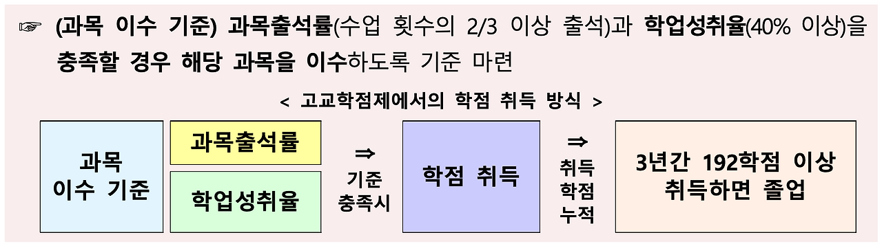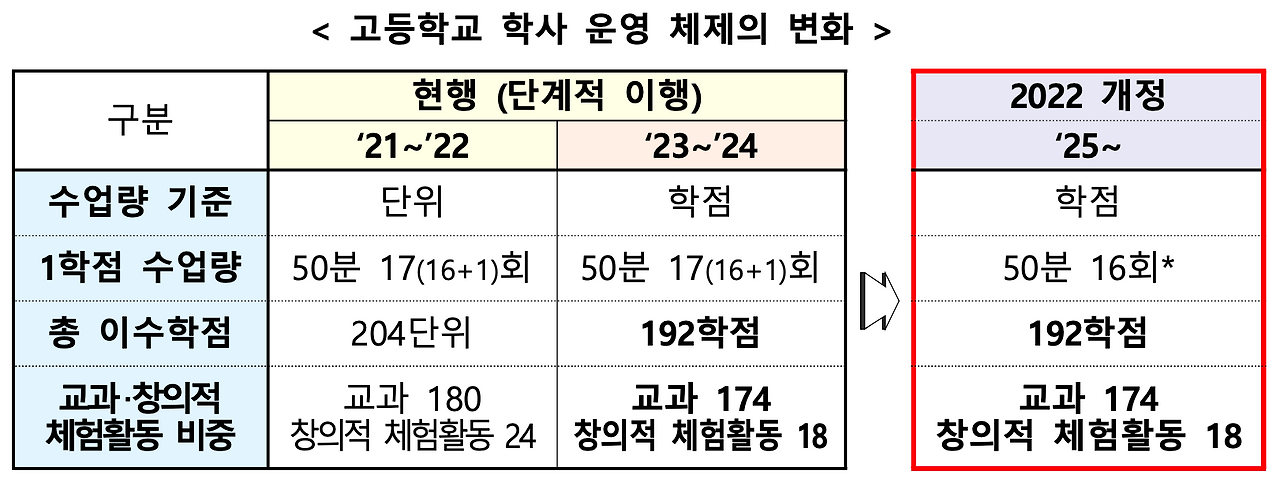 2022 개정 교육과정의 핵심은 고등학교 학점제 운영에 있다. 가장 많은 사람들의 관심이 집중된 부분이기도 하다. 수업량의 기준인 '단위'라는 개념은 '학점'의 개념으로 변경되었으며, 1학점의 분량도 50분 수업 17회에서 16회로 1차시 분량을 줄였다. 학교의 학습량 적정화에 대한 요구는 과거부터 있었지만, 이렇게 전격적으로 실시된 적은 없었던 것 같다. 그동안 각 교과별로 서로 양보하지 않는 상황이 심각했었는데, 2022 개정 교육과정 시안에서는 이를 '교과 이기주의'라고 명확하게 표현하고 있으며 이를 극복하기 위하여 모든 과정에서 노력을 했다고 설명하고 있다. 결과적으로는 고등학교에서 그동안 주요 교과로 여겨졌던 국어, 영어, 수학 등의 수업량이 줄어든 것으로 보이는데, 벌써부터 학력 저하에 대한 우려의 목소리가 나오는 것을 보면 우리 사회가 고등학교 교육을 대학입시의 준비과정으로 해석하는 경향은 쉽게 변하기 어려운 것 같아 아쉬움이 남는다. 내용적인 측면을 들여다보지 않더라도, 고등학교의 학습량을 줄였다는 것만으로, 나는 2022 개정 교육과정을 응원하는 마음이 커졌다.