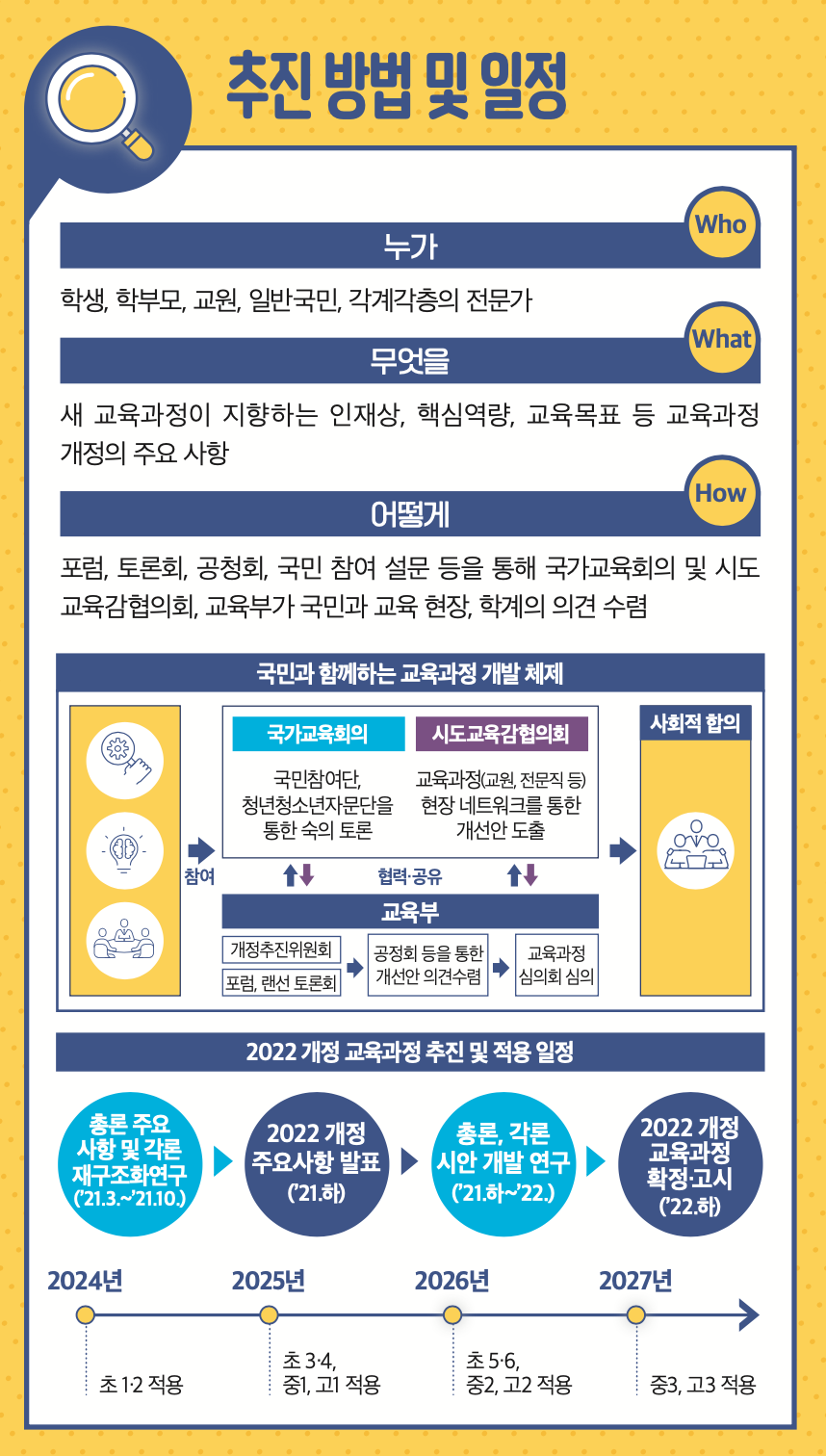 교육부의 발표에 따르면, 2022 개정 교육과정은 교육과정 개정을 추진하는 모든 과정에서 다양한 사회 구성원의 의견을 수렴하고 반영하고자 노력하였다고 한다. 교육과정평가원 홈페이지에서 안내하고 있는 구체적인 추진방법 및 일정은 다음 그림과 같다.