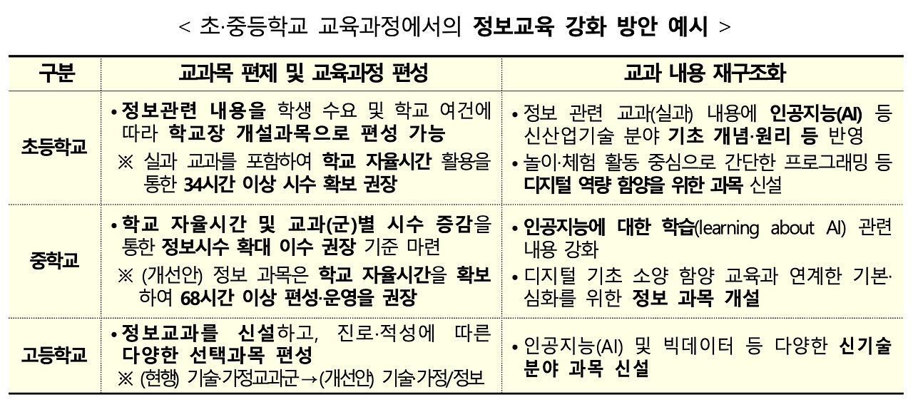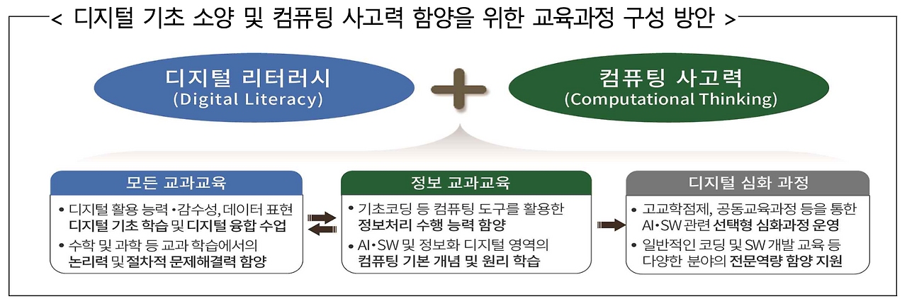 디지털 기초 소양을 어떻게 길러줄 것인가의 방향도 이전보다는 훨씬 더 구체적으로 진술하고 있다. 학습 역량을 함양하기 위해 필요한 디지털 리터러시 교육을 넘어서, 컴퓨팅 사고력을 길러주기 위한 정보 교과 교육의 목표까지 함께 제시하였다. 정보 교과 수업의 시수를 어떻게 확보해야 할 것인지까지 구체적으로 명시하고 있는 것을 보면, 학교교육에서 정보 교과의 중요성이 지금보다는 훨씬 커질 것으로 보인다.
