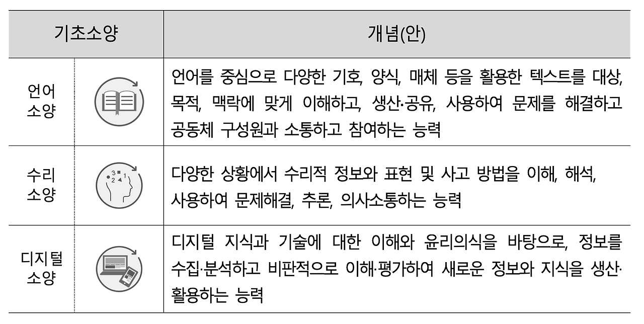 2022 개정 교육과정은 기초소양(Literacy)의 중요성을 더욱 구체적으로 명시하고 있다. 학습을 위해 필요한 기초소양을 정의하여 총론에 반영하고, 각 교과별로 기초소양을 길러주고 활용할 수 있도록 하겠다는 것이다. 2022 개정 교육과정이 정의한 기초소양의 개념은 다음과 같다.