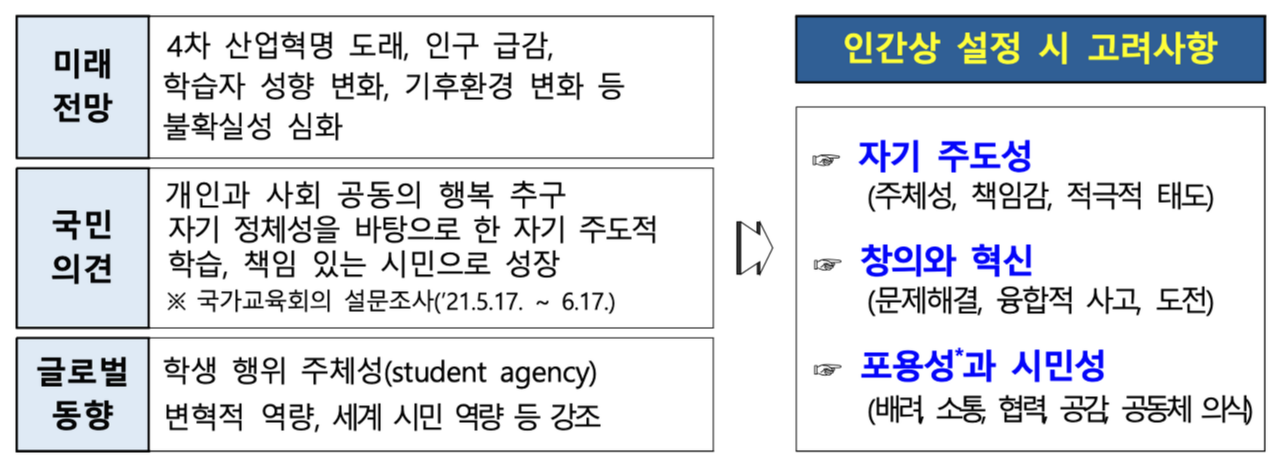2022 개정 교육과정의 핵심을 정리한 내용은 다음의 그림과 같다. 추구하는 인간상이 아직 확정되었다는 표현은 없었지만, '포용성'과 '창의성', 그리고 '주도성'에 방점이 찍혀있는 것만은 분명한 것으로 보인다. 창의적이고 자기주도성을 갖춘 인재를 길러내야 한다는 이야기는 워낙 오래 전부터 강조된 부분이었기에 새로울 것이 없지만, '포용성'이라는 부분은 이번 2022 개정 교육과정에서 새롭게 강조되고 있는 부분이다.