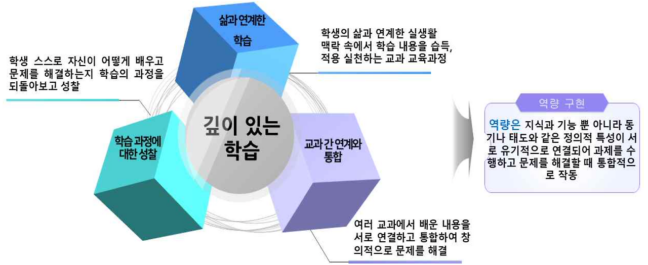 학습의 과정은 '깊이 있는 학습'을 목표로 한다. 깊이 있는 학습을 위하여 '삶과 연계한 학습', '학습 과정에 대한 성찰', '교과 간 연계와 통합'을 추구한다. 서로 단절된 학습을 제공하는 것으로는 역량을 함양하기 어렵기 때문에, 유기적으로 연결되어 깊이를 더해가는 학습의 경험을 제공하겠다는 것이다. 전세계적으로 교육의 지향점은 비슷한 것으로 느껴지며, 새로운 가치를 창출할 수 있는 학생들을 길러내겠다는 방법론 역시 비슷한 것으로 이해된다. 투입과 산출이라는 간단한 논리적 분석이 아니라, 눈에 보이는 성과가 없다고 하더라도 장기적인 관점에서 가치와 철학을 가지고 교육의 방향을 유지할 수 있었으면 하는 마음이다.