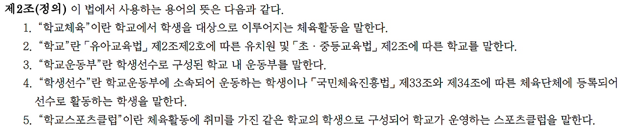 학교스포츠클럽활동은 정규 교육과정 외 동아리 활동이다. 학교체육진흥법 제2조에 명시된 것과 마찬가지로 스포츠를 즐기고 싶어하는 학생들이 모여서 함께 운동하기 위하여 구성한 자발적인 동아리의 성격을 가지고 있다. 이것은 가장 바람직한 형태의 스포츠 활동이며 학교체육, 나아가 우리사회가 꿈꾸는 스포츠권의 실현을 위한 시작점이기도 하다. 따라서, 많은 체육 교육 전문가들이 학교스포츠클럽 활성화를 위하여 노력하였으며, 그 결과 학교체육 활성화와 내실화가 이루어졌으며, 시도교육청이 주관하는 학교스포츠클럽대회와 교육부 주관의 전국적인 학교스포츠클럽대회가 체계를 갖추어 발전하기에 이르렀다. 학교스포츠클럽활동은 학교체육 활성화의 척도로 활용되기도 하였으며, 학교 현장의 체육 교사들이 체육 교과수업 다음으로 집중하고 있는 학교체육의 중요한 분야이기도 하다.