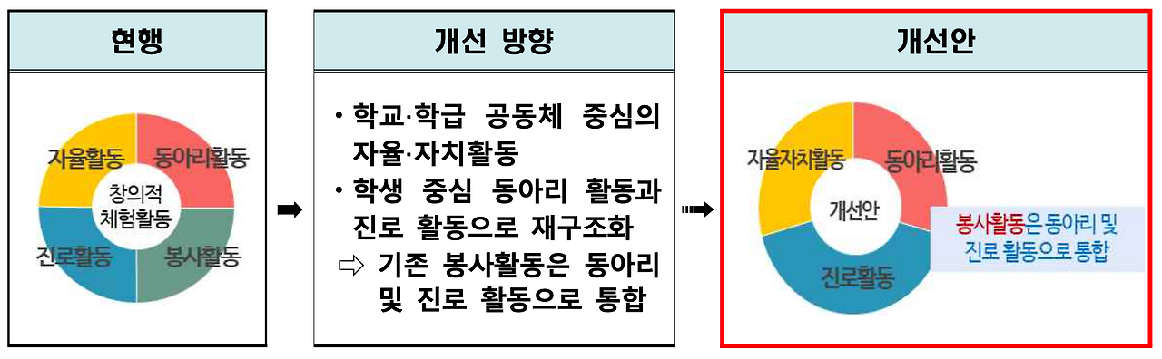 창의적 체험활동의 영역도 축소되었다. 이른바 '자-동-봉-진'에서 '봉', 봉사활동이 빠지게 된 것이다. 지난 2년의 시간 동안 사실상 유명무실하게 운영될 수밖에 없었던 봉사활동이었다. 최초 도입 때의 시대적 요구와 지금의 시대적 요구 역시 분명 다를 것이다. 봉사활동의 진정한 가치를 경험하기 위해서는 자발성이 중요하다는 의견을 반영한 것으로 보인다. 학생의 입장에서나 학교의 입장에서 부담이 감소된다는 측면은 분명 환영할 일이라고 생각한다.