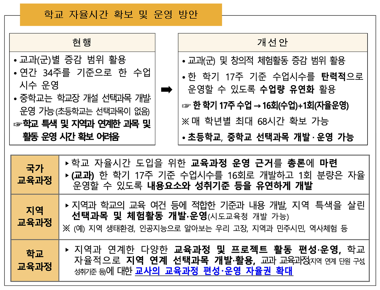 학교의 자율성은 더욱 확대된다. 이 부분은 일반적인 교사와 학교 관리자의 입장이 조금 다를 수도 있는 부분인데, 시대적인 흐름에 따라 학교가 자율적으로 교육과정을 구성할 수 있도록 지원하는 방향으로 개정되는 것으로 이해된다. 물론, 과거와 같이 국가가 정해 준 틀 안에서 단순히 내용을 잘 전달하는 것을 선호하는 교사가 일부 존재할 수는 있겠지만, 요즘 교사들은 교육과정 편성 및 운영의 자율성 확대를 요구하는 목소리가 더욱 큰 것으로 느껴진다. 이러한 맥락에서 학교의 자율성을 확대하는 것은 시대성에 맞는 판단이 아닌가 생각한다. 교육 당국의 입장에서는 학교간 격차, 교사간 격차가 발생하지 않도록 교육 역량을 끌어올리는데 더욱 노력해야 한다는 어려운 과제가 생긴 듯 하다.