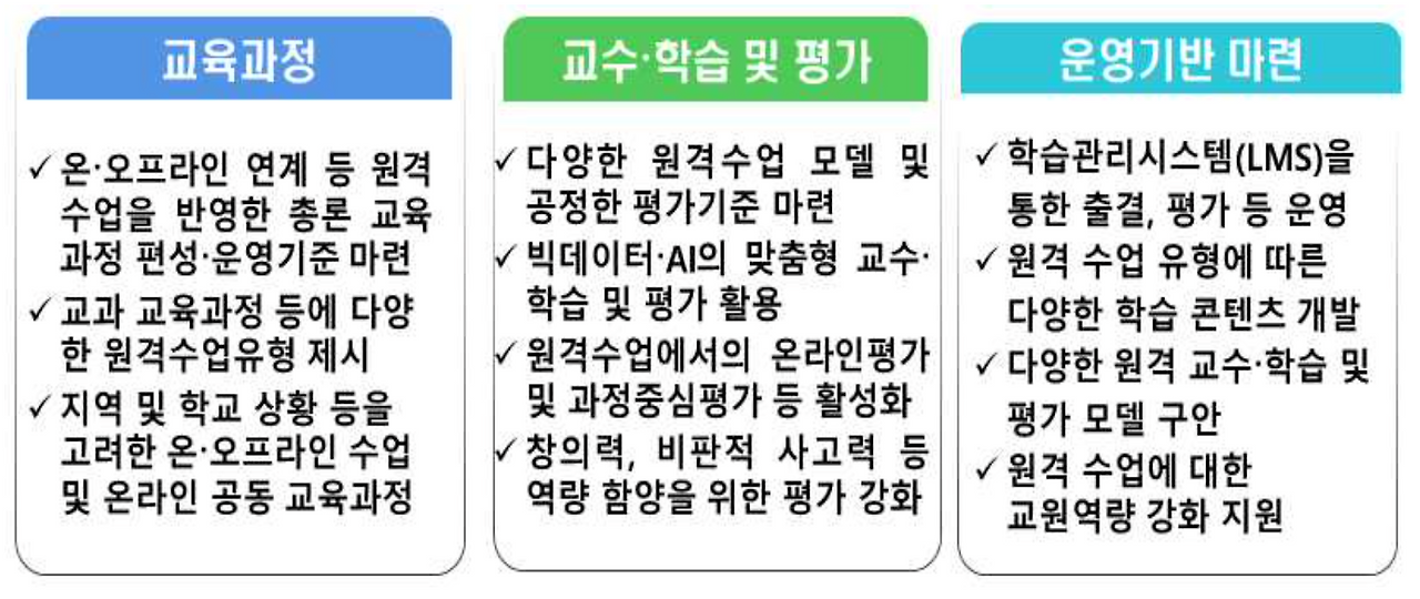 전체적인 방향은 미래지향적인 관점에서 교육과정을 개정해야 한다는 것에 집중되어 있는 것으로 보인다. 디지털 기초소양(Digital Literacy)이 교육과정 전반에 걸쳐 강조되고 있는 것도 눈에 띈다. 개인적으로 드는 느낌은 우리나라 교육 시스템과 자원에 대한 자신감을 바탕으로 방법론적인 부분을 구체화하는데 초점을 맞추고 있는 것은 아닌가 싶다. 제도적인 측면, 학생이 역량을 함양할 수 있도록 지원하는 측면 등에 많은 설명을 하고 있는 것을 확인할 수 있다.